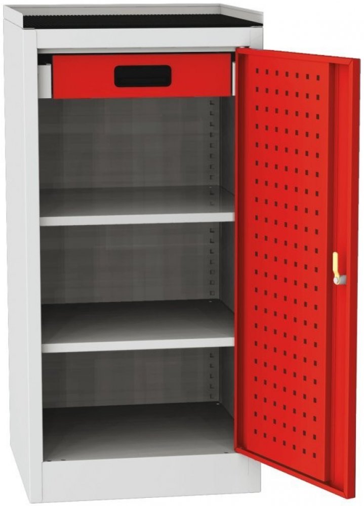 Dílenská skříňka na nářadí, šířka 500, výška 1030, hloubka 500 mm. Horní odkládací plocha s gumovou podložkou a s okrajem proti přepadnutí drobných předmětů. Barva korpusu RAL 7035 světle šedá.