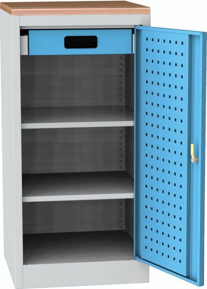 Dílenská skříň na nářadí 1018x500x500 mm, 1 zásuvka, 2 police a dřevěná buková spárovka pro odkládání předmětů skříňka je určena do výrobních prostor, opraven, autoservisů, škol, apod...vhodná pro uskladnění nářadí, materiálu, měřidel...svařovaný korpusdřevěná buková spárová deska výšky 25 mm pro odkládání předmětů.2 police, výškově přestavitelné po 25 mm1 zásuvkavnitřní strana dveří je vybavena Q-system perforací pro uchycení držáků nářadínosnost police a zásuvky 20 kgnosnost korpusu 200 kgjednobodové uzamykání cylindrickým zámkem se 2 klíčizámek je umístěn uprostřed dveříbarva korpusu vždy světle šedá RAL 7035barva dveří dle výběru: světle šedá RAL 7035, modrá RAL 5012, žlutá RAL 1023, červená RAL 3000, zelená RAL 6024, tmavě šedá RAL 7031