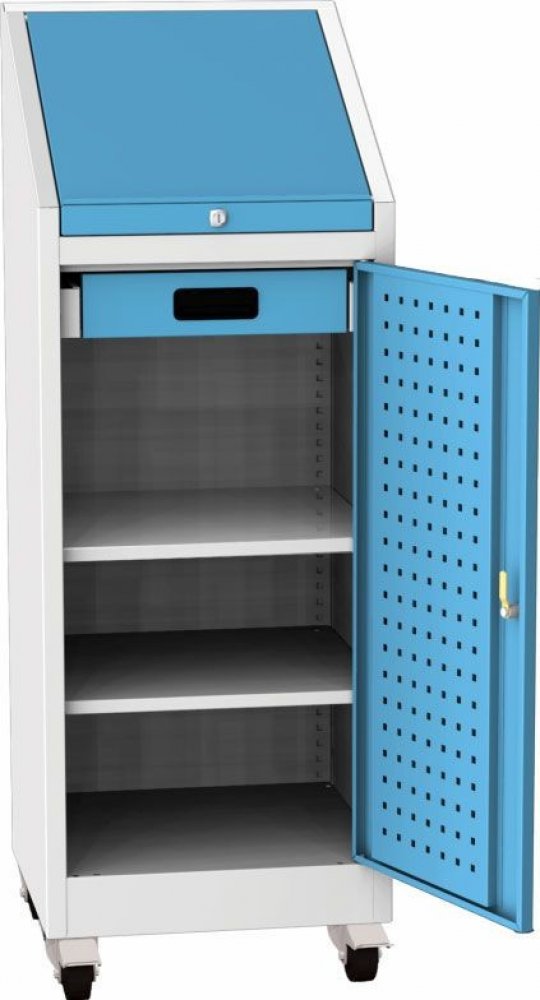 Dílenská skříňka 1410x500x500 mm, pojízdná, 2 police, 1 zásuvka a integrovaný psací pult skříňka je určena do výrobních prostor, opraven, autoservisů, škol, apod...vhodná pro uskladnění nářadí, materiálu, měřidel...svařovaný korpuspojezdová kolečka průměru 80 mm, 2x pevná, 2x otočná s brzdou2 police, výškově přestavitelné po 25 mm1 zásuvkaintegrovaný psací pultpod psací plochou je uzamykatelný prostor na dokumenty a psací potřebyvnitřní strana dveří je vybavena Q-system perforací pro uchycení držáků nářadínosnost police a zásuvky 20 kgnosnost korpusu 200 kguzamykání cylindrickým zámkem se 2 klíčizámek je umístěn uprostřed dveříbarva korpusu vždy světle šedá RAL 7035barva dveří dle výběru: světle šedá RAL 7035, modrá RAL 5012, žlutá RAL 1023, červená RAL 3000, zelená RAL 6024, tmavě šedá RAL 7031