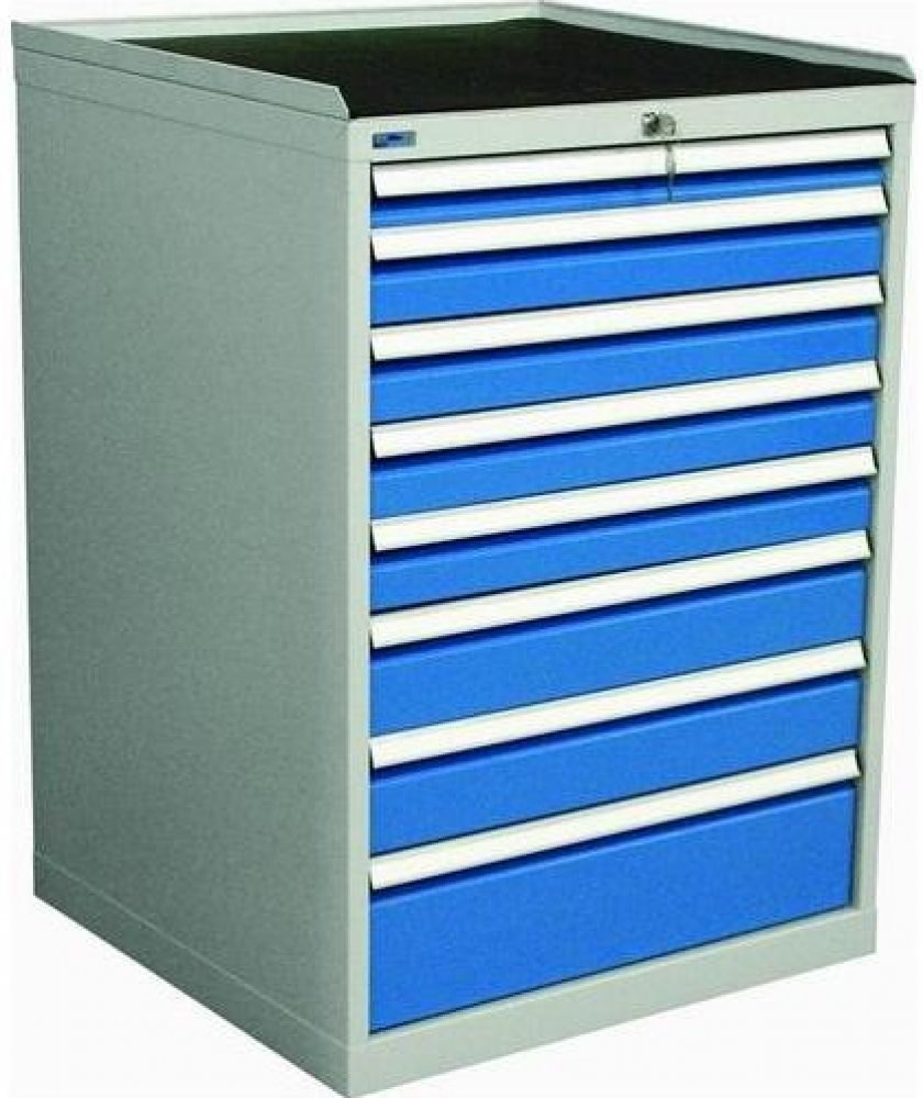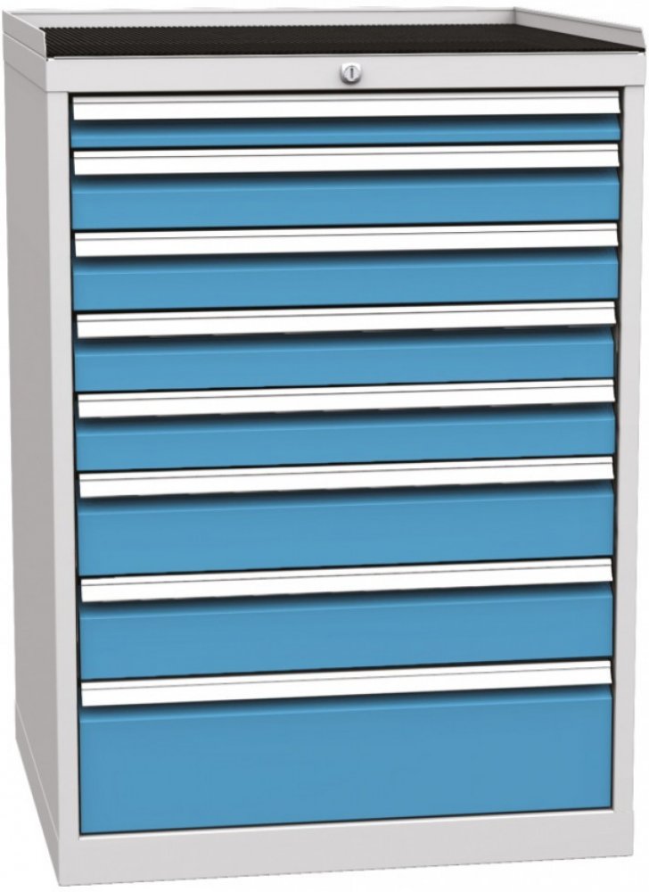 Osmizásuvková dílenská skříňka, šířka 720, výška 1030, hloubka 700 mm. Výsuv zásuvek 80%, nosnost zásuvek 80 kg, centrální zámek. 1x zásuvka 60, 4x 90, 2x 120, 1x 180 mm. Barva korpusu RAL 7035 světle šedá.