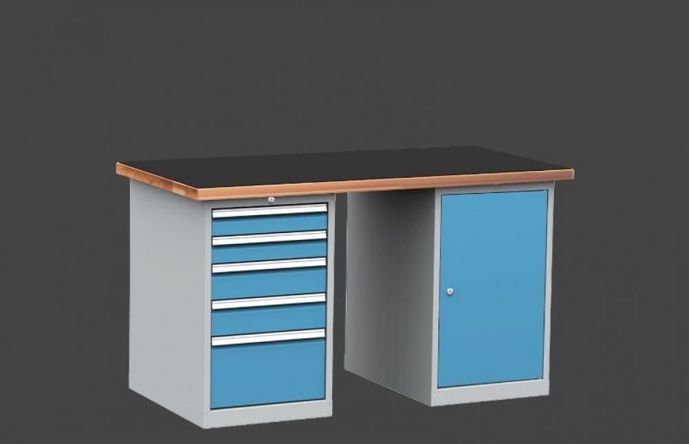 Montovaný dílenský stůl 1500 s bukovou spárovkou 40 mm a hladkou pogumovanou pracovní plochou 4 mm, 5-ti zásuvkový kontejner a skříňka montovaný dílenský stůlbuková spárovka 40 mm s hladkou gumou 4 mmodolná pracovní deska z lepených bukových hranolůdeska je broušená a ošetřená roztokem lněného oleje s přísadamihorní obvodové hrany sraženy5-ti zásuvkový kontejner šíře 500 mmzásuvky s masivními výsuvy s vysokou nosnostíuzamykání cylindrickým zámkem se 2 klíči, 2000 kombinacívybaveno mechanismem blokace pro vysunutí více zásuvekdveřový kontejner šíře 500 mm2 výškově přestavitelné police po 25 mmdveře zavěšeny na vnitřních čepechvnitřní strana dveří je perforovaná pro zavěšení držáků nářadíuzamykání cylindrickým zámkem se 2 klíči, 2000 kombinacímožnost barevného provedení dveří/čel zásuvek: světle šedá RAL 7035, žlutá RAL 1023, červená RAL 3000, modrá RAL 5012, zelená RAL 6024, tmavě šedá RAL 7031nosnost stolu 500 kg při rovnoměrném rozložení zatížení