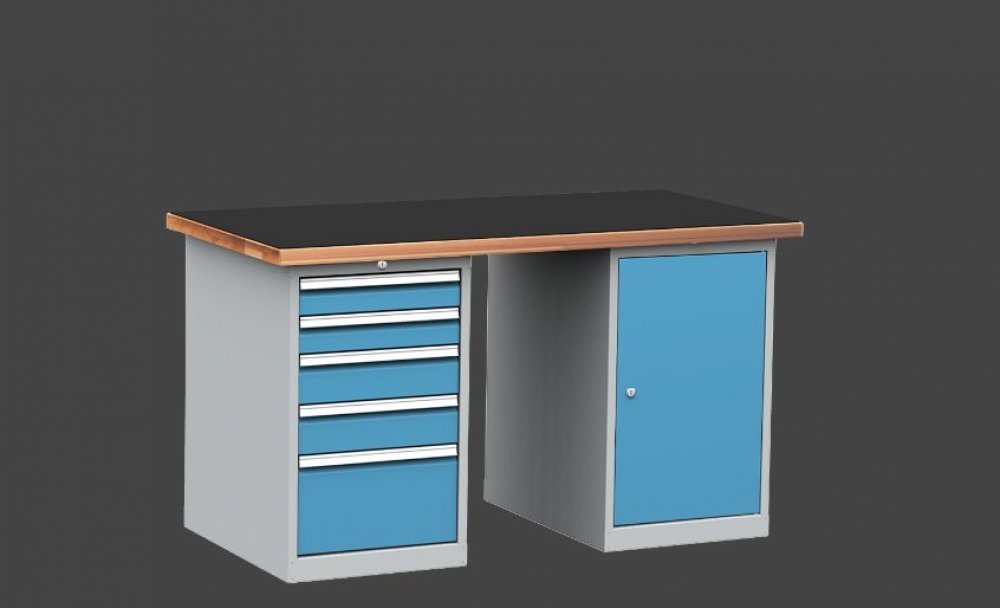 Montovaný dílenský stůl 1500 s bukovou spárovkou 40 mm a vroubkovanou pogumovanou pracovní plochou 6 mm, 5-ti zásuvkový kontejner a skříňka montovaný dílenský stůlbuková spárovka 40 mm s vroubkovanou gumou 6 mmodolná pracovní deska z lepených bukových hranolůdeska je broušená a ošetřená roztokem lněného oleje s přísadamihorní obvodové hrany sraženy5-ti zásuvkový kontejner šíře 500 mmzásuvky s masi...