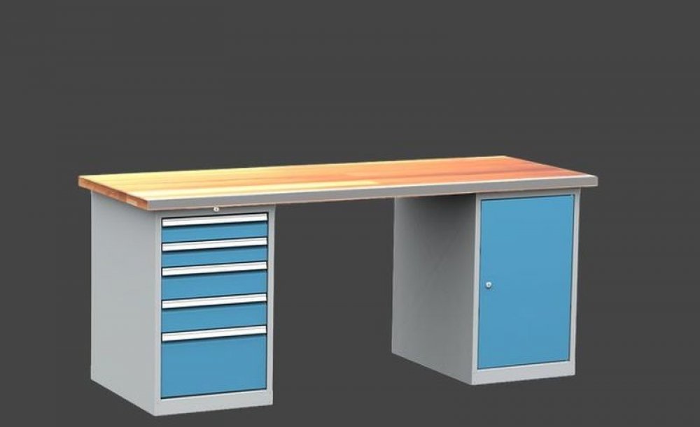 Montovaný dílenský stůl 2000 s oplechovanou nerezovou přední hranou bukové spárovky, 5-ti zásuvkový kontejner a skříňka montovaný dílenský stůlbuková spárovka 40 mm s oplechovanou přední hranoujedná se o pozinkovaný plech tloušťky 1 mmoplechování je ve tvaru Udeska je chráněna shora i ze spoduhorní část desky je v místě oplechování snížená kvůli plynulému navázáníodolná pracovní deska z lepených b...