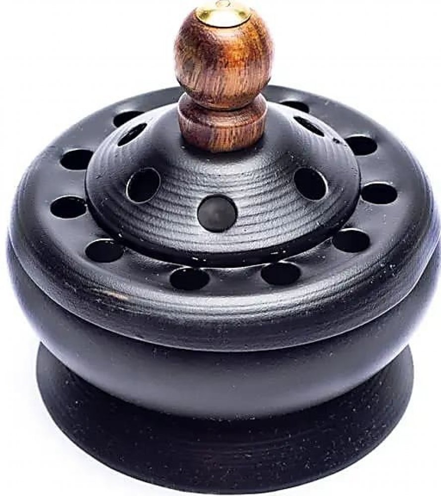 Tato černá kovová kadidelnice s víkem vám umožní bezpečně pálit byliny, pryskyřice i sypané směsi. Otvory ve víku zajišťují pozvolné uvolňování vůně a dřevěná rukojeť usnadňuje manipulaci. Díky kompaktnímu rozměru průměr 7,5 cm se hodí domů i na zahradu nebo terasu.