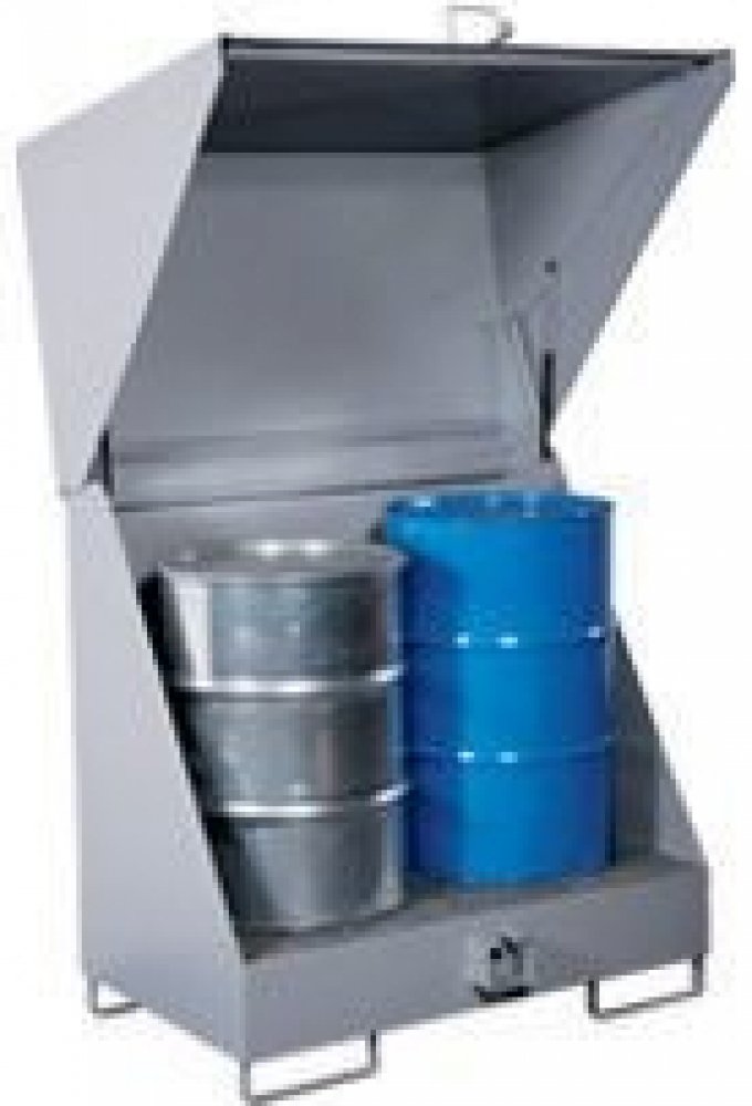 tato krytá uzamykatelná záchytná jímka slouží k bezpečnému skladování 200 l sudů nebo jiných nebezpečných kapalin
