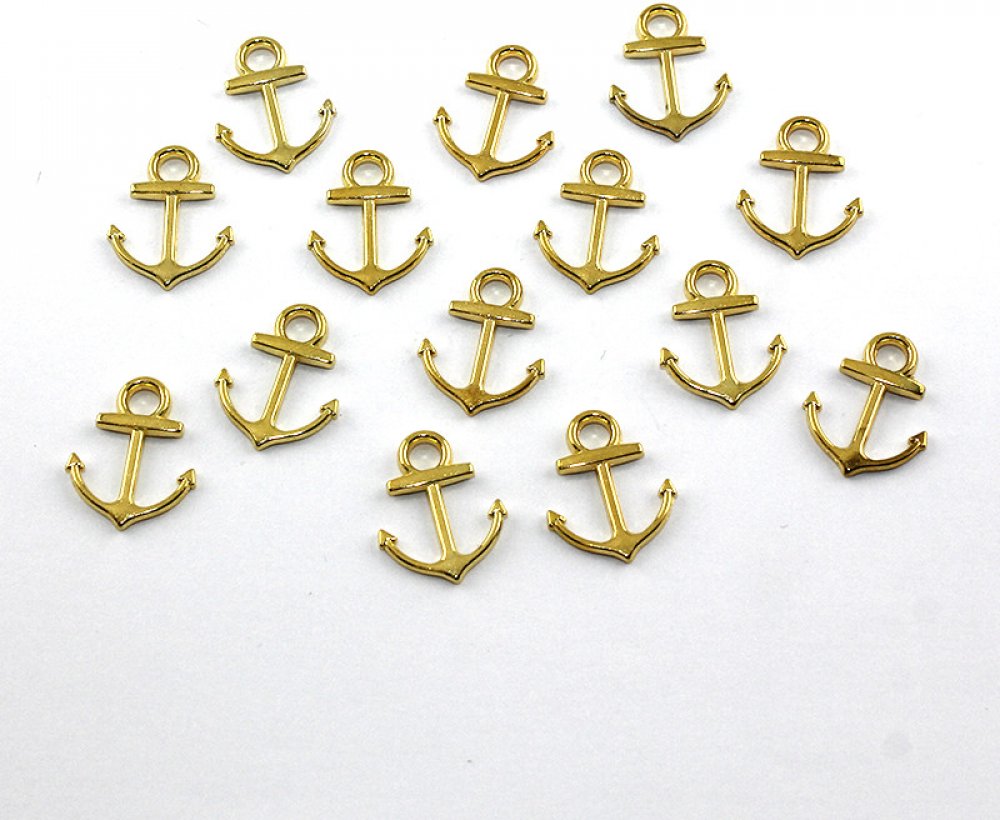 Kovový přívěsek ve tvaru kotvy o výšce 19 mm, šířce 15 mm, hloubce 5 mm s velikostí průvleku 3 mm. Přívěsek ve zlatém provedení je vyroben z bižuterního kovu. Přívěsek neobsahuje olovo ani kadmium. Součástí přívěsku je očko na zavěšení. Doporučujeme zakoupit spojovací kroužek ve stejném barevném provedení. Přívěsek prodáváme po jednom kusu.