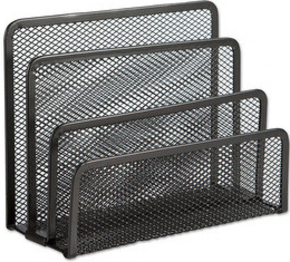 \nKovový stojánek na dopisy se třemi přihrádkami, šířka 17,5 cm, výška 13,5 cm, hloubka 7,7 cm.\n