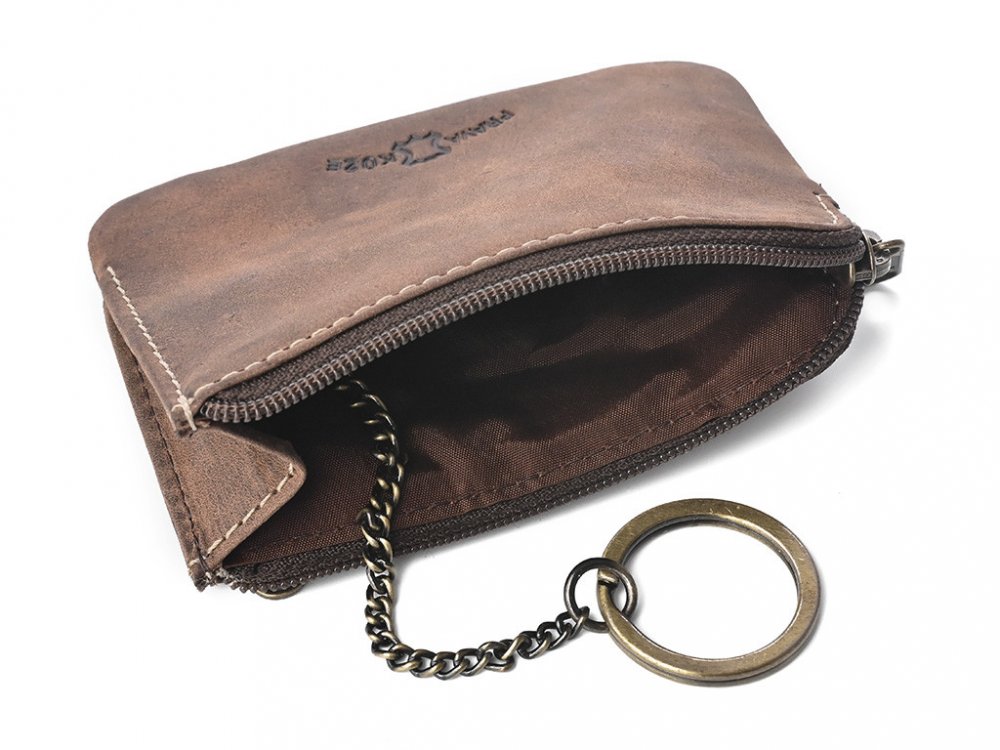 Kvalitní kožená klíčenka klasického designu hnědé barvy. V klíčence nalezneme jeden kroužek na klíče na řetízku. Pokud ho sundáte, lze použít i jako mikro peněženka (vejde se platební karta apod.).