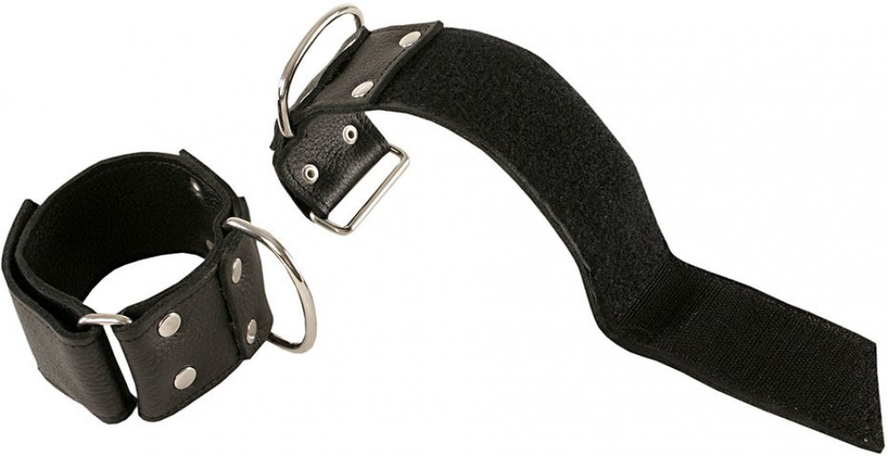Základní pouta na zápěstí ze silné, vzorované kůže, s masivními D-kroužky. Zapínání na suché zipy je spolehlivé, extra pevné a umožňuje nastavení obvodu na milimetr přesně.