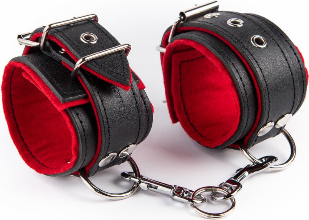 Kožená černá pouta na ruce black/red podšitá červenou plstí. Šířka pout je 5 cm a obvod 14 - 25 cm. Pouta jsou spojená dvěma karabinami, které se dají rozpojit.