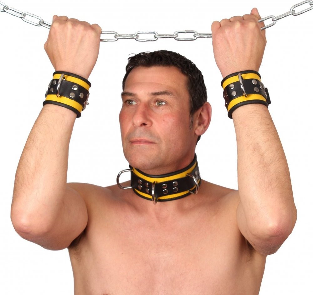 Kožená pouta na ruce "The Red" žluto-černá s lemováním
