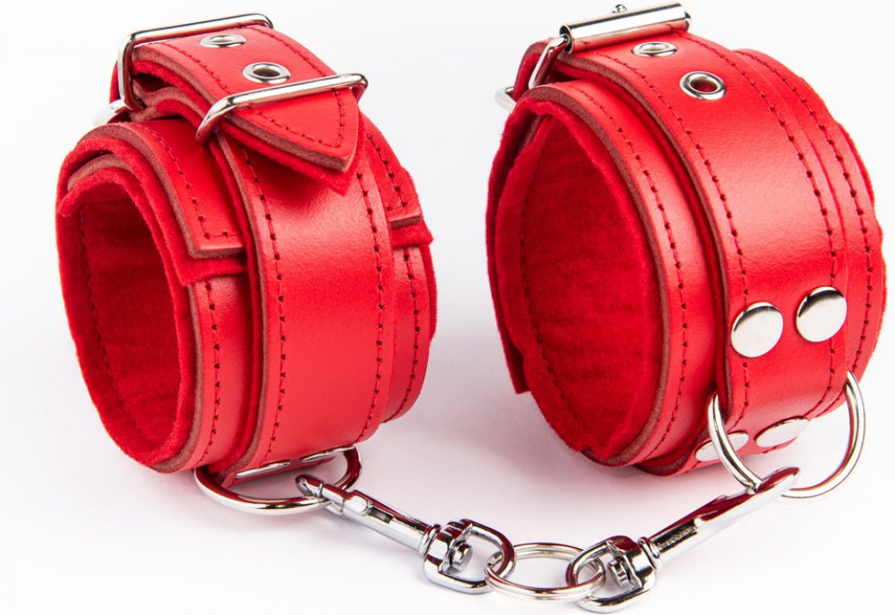 Kožená červená pouta na ruce red/red podšitá červenou plstí. Šířka pout je 5 cm a obvod 14 - 25 cm. Pouta jsou spojená dvěma karabinami, které se dají rozpojit.