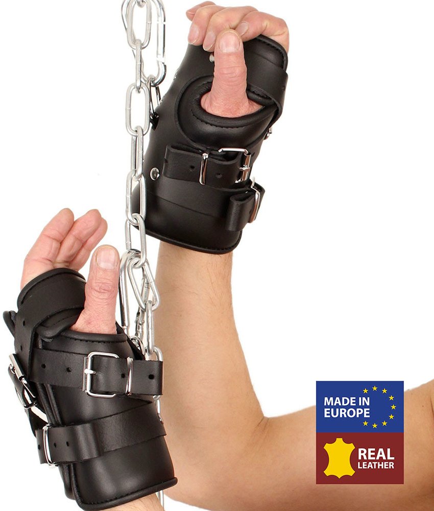 Masivní zavěšovací pouta na ruce s přezkami okolo dlaně a zápěstí. Oko pro zavěšení je umístěné na malíkové hraně. Zapínání na 2 přezky umožňuje dokonale správné utažení.