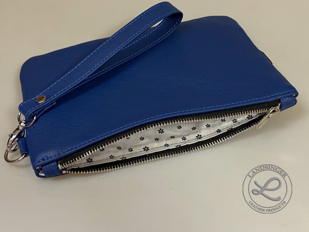 Luxurious blue leather clutch bag with wrist strap. Elegant clutch bag. Zip fastener. The leather clutch bag includes a removable wrist strap with snap hook. The leather clutch bag has an undivided interior and 100% cotton lining.