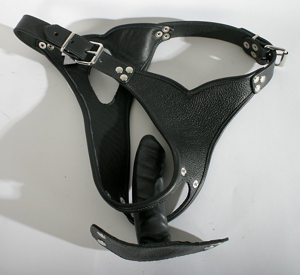 Otevřené kožené kalhotky s otvorem v rozkroku a odepínatelným latexovým dildem. Zapínání na přezky na bocích.