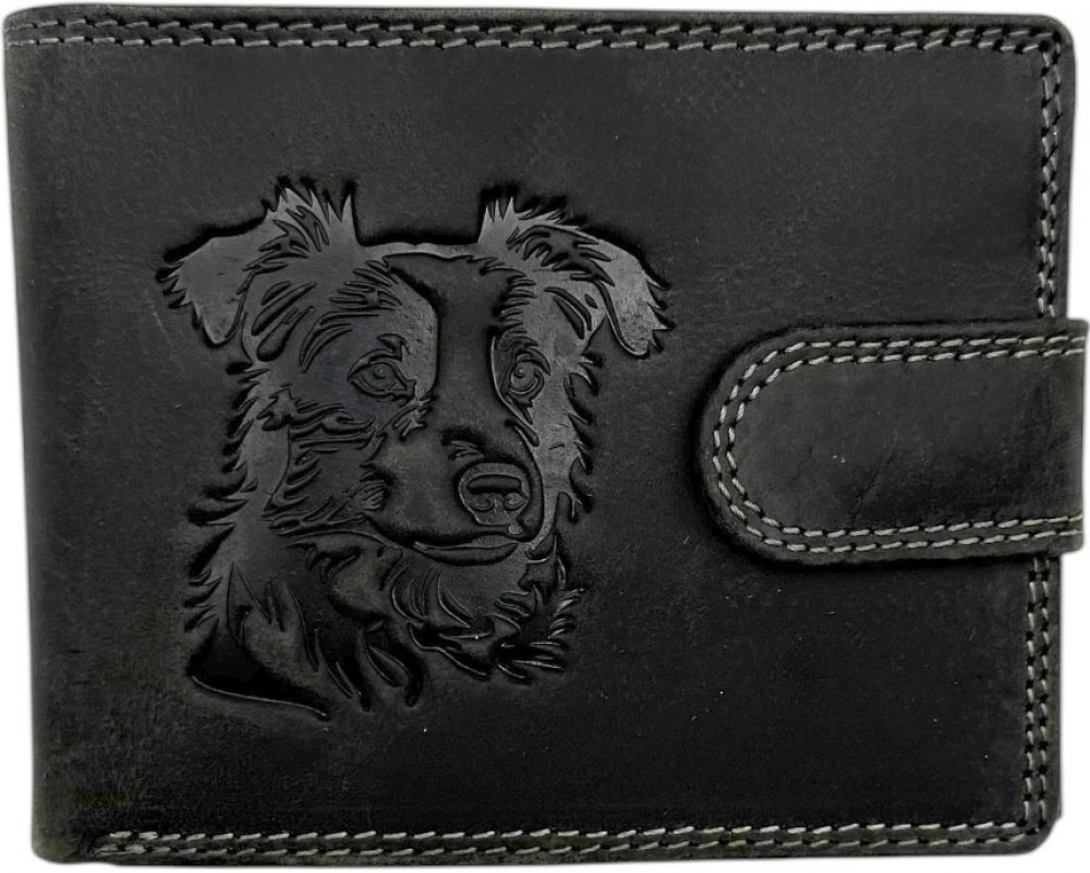 Pánská kožená peněženka s motivem psa Border Kolie. Do peněženky se bez problémů vejdou i 5000 Kč bankovky, aniž by vyčnívaly. Obsahuje klasický vnitřní mincovník uzavíratelný na druk.