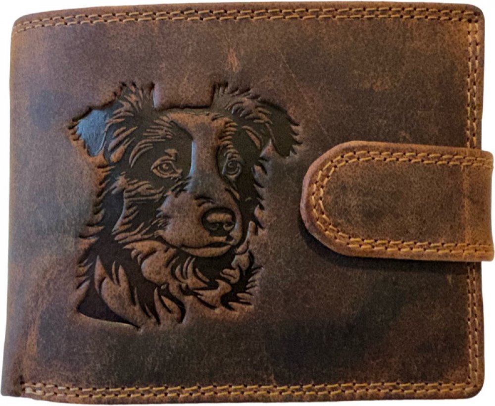 Pánská kožená peněženka s motivem psa Border Kolie. Do peněženky se bez problémů vejdou i 5000 Kč bankovky, aniž by vyčnívaly. Obsahuje klasický vnitřní mincovník uzavíratelný na druk.