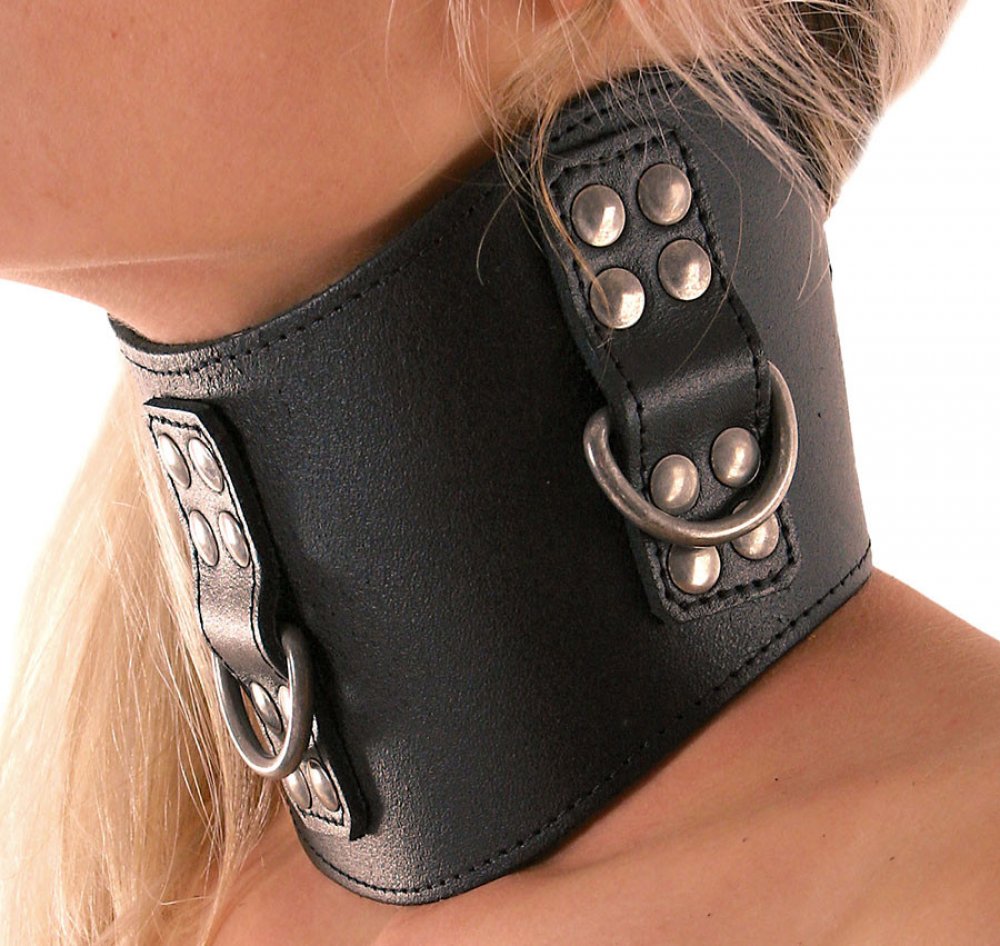 Široký kožený obojek s anatomicky tvarovaným okrajem a se třemi masivními poutacími D-kroužky.