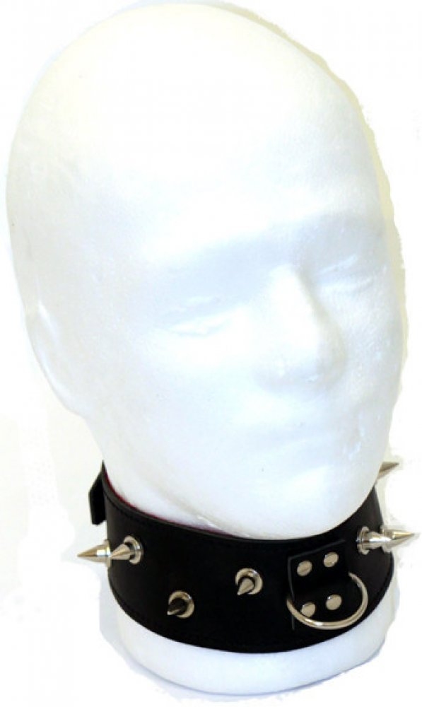 Kožený obojek s hroty a D kroužkem na vodítko je anatomicky tvarovaný do obloučku, takže perfektně sedí. Z rubové strany příjemná, měkká, červená plsť. Šířka 5cm, délka 52 cm, vhodný pro obvod krku do 41cm.