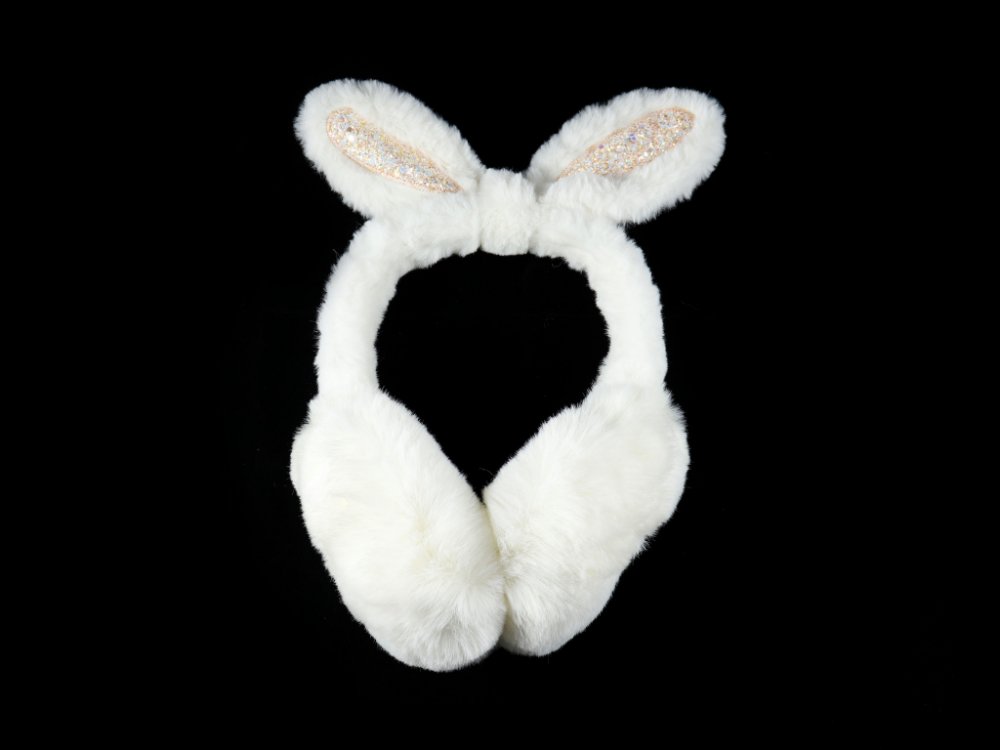 Chlupaté klapky na uši ve smetanové barvě a králičími oušky se třpytkami. Uši jsou tvarovatelné, lze je také oddělat a klapky použít bez nich.