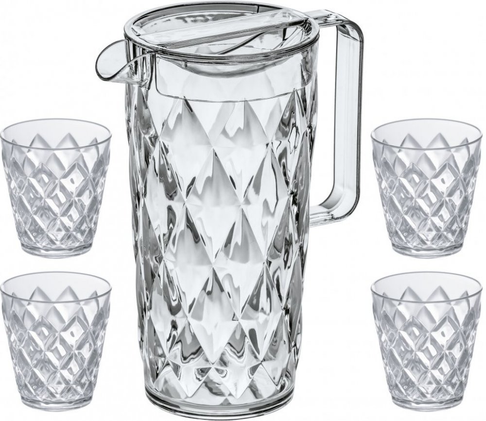 Džbán CRYSTAL 1,6 l + 4 skleničky 200 ml, čirá od německé značky Koziol. Džbán se skleničkami je ideální pro letní osvěžující nápoje.