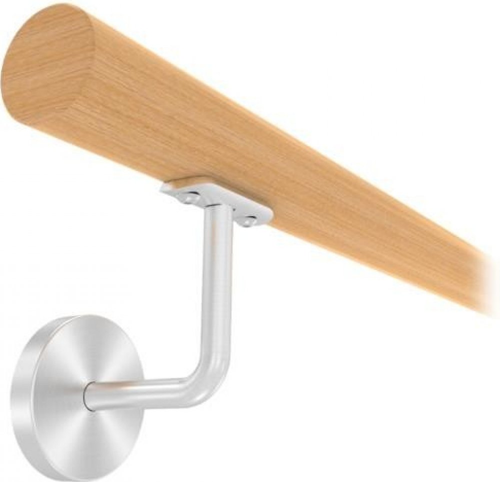 KP-41121, délka 300 cm Nerezové schodišťové zábradlí na stěnu s dřevěným madlem kulatého průřezu a kulatými držáky s krycí rozetou. V madle jsou již předvrtané otvory pro snadné uchycení držáků.