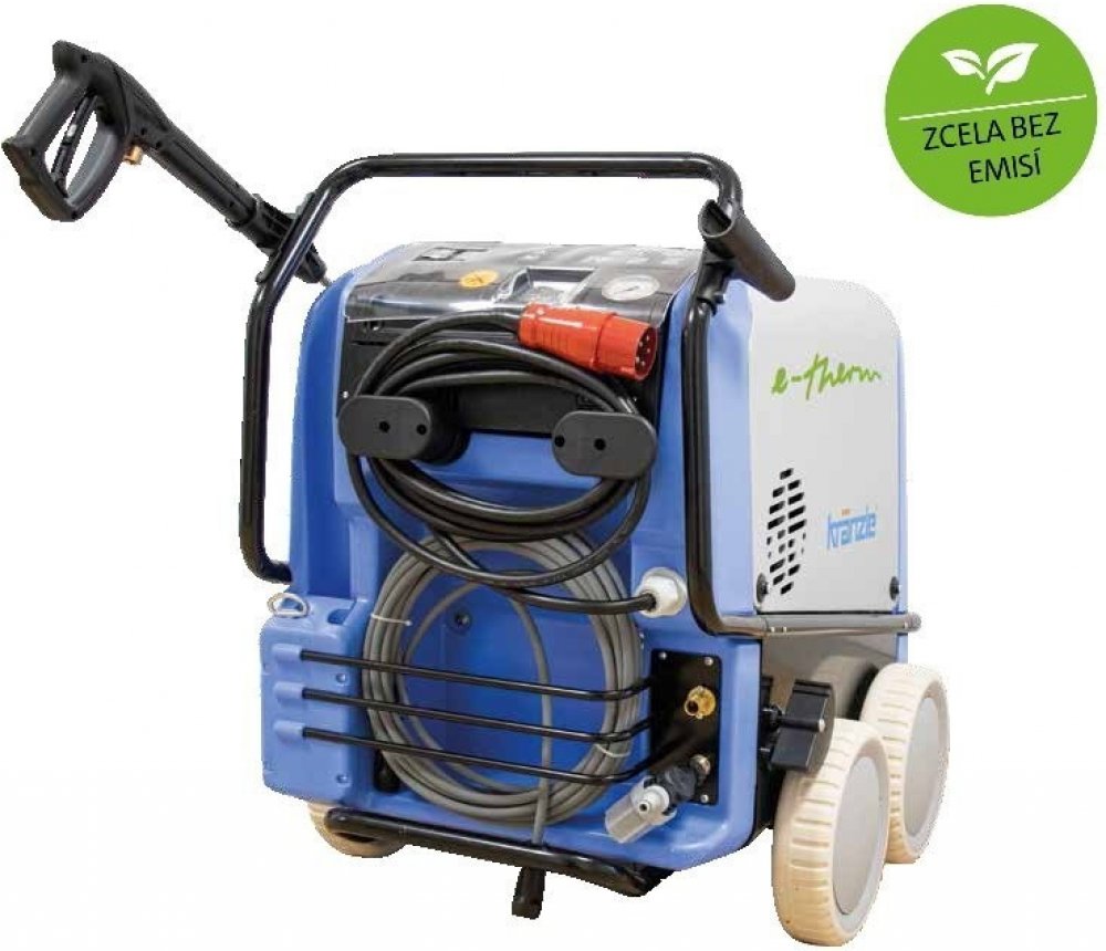 Zejména v oblastech aplikace citlivých na životní prostředí, emise a hygienu, jako např. řeznictví nebo chov zvířat, je provoz zařízení na horkou vodu s naftovým ohřevem spojený s rozsáhlými opatřeními pro odstraňování výfukových plynů. Právě tam je nová řada e-therm Kränzle s elektrickou topnou jednotkou jasná volba! V nabídce je osum modelů s elektrickým vyhříváním s příkonem od 18 kW až do 48 kW. Nabízí spolehlivý ohřev v závislosti na teplotě vstupní vody až do 80 °C. Stroj vhodný do interiérů.
