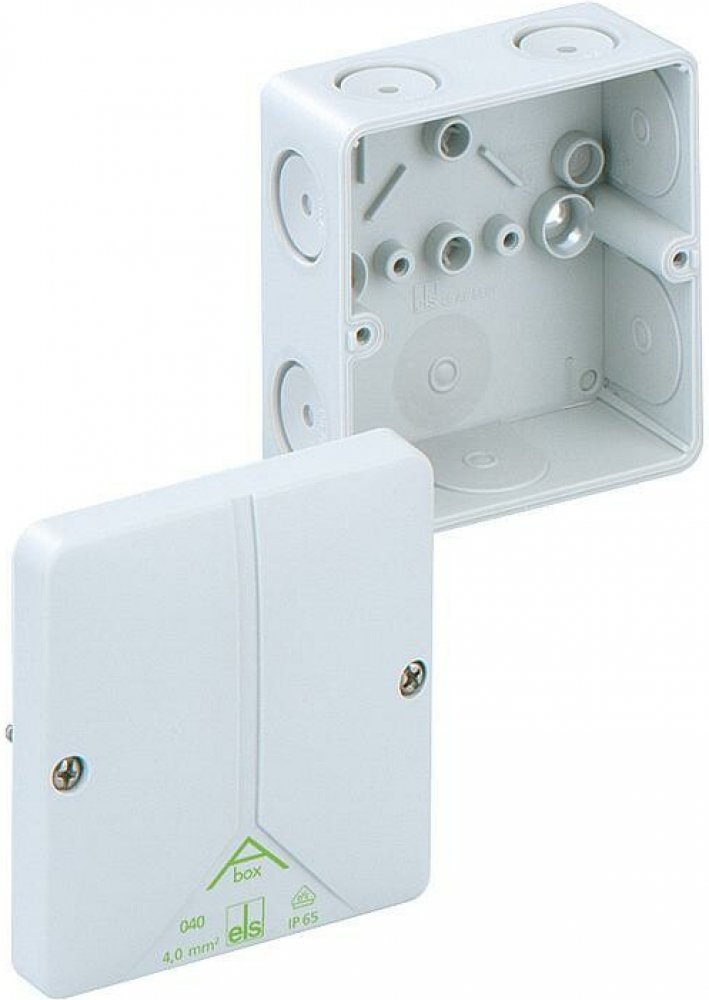 Rozbočovací krabice Abox 040-L šedá nástěnná, krytí IP65. Průchody: 7 zboku, 1 zezadu. Napětí 690 V AC, průřez 4mm², montážní otvory uvnitř, certifikát VDE. Spelsberg 80490701