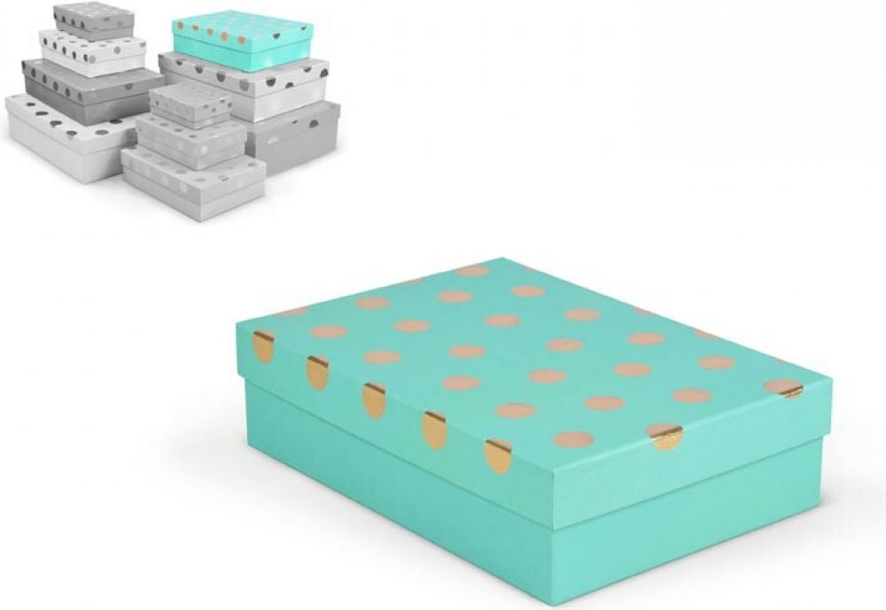 Dárková krabice v mixu barev se zlatými puntíky. Vhodná pro slavnostní příležitosti, dekorativní účely, balení osobních darů nebo k uschování různých drobností. Při vložení jedné krabičky do košíku se automaticky přidá celá sada, která zahrnuje krabičky s různými designy a velikostmi. Tato variabilita zaručuje, že budete mít kr...