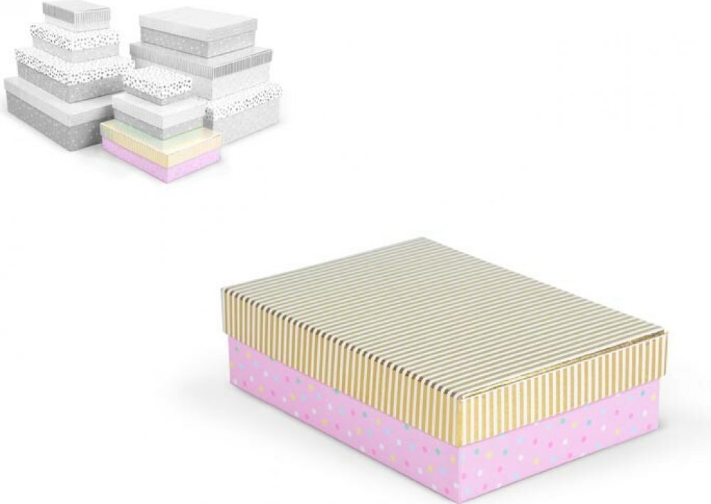 Dárková krabice v mixu pastelových barev s různými vzory, jako jsou puntíky, proužky nebo texturovaný povrch. Vzory a barvy jsou sladěny tak, aby vytvářely harmonický a elegantní vzhled. Vhodná pro slavnostní příležitosti, dekorativní účely, balení osobních darů nebo k uschování různých drobností. Při vložení jedné krabičky do košíku se automaticky přidá celá sada, která zahrnuje krabičky s různými designy a velikostmi. Tato variabilita zaručuje, že budete mít krabičky vhodné pro různé příležitosti a typy dárků. Krabičky jsou elegantně navrženy a ladí k sobě svými barvami a vzory, čímž vytvářejí harmonickou sadu ideální pro každou příležitost.