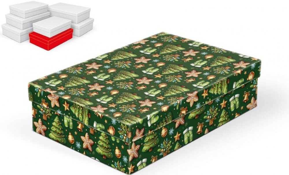 Vánoční dárková krabice o rozměrech 28 x 18 x 7 cm Vánoční dárková krabice je pokryta dekorativním papírem s vánočními motivy. Povrch krabice zdobí vzor se zelenými vánočními stromečky, zlatými hvězdami, vánočními ozdobami a perníčky ve tvaru hvězd. Barva pozadí je tmavě zelená, což vytváří krásný kontrast s barevnými motivy. Jejich slavnostní a elegantní vzhled je ideální pro balení vánočních dárků. Materiál: 1,5 mm karton, potažený luxusním papírem. Uvedená cena je za 1 ks.