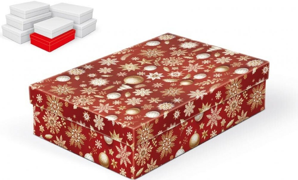 Dárková vánoční krabice se svátečním vzhledem, která je celá laděná do červena doplněna bílými a zlatými motivy vloček, hvězd a ozdob. Tento výrazný design okamžitě navodí kouzelnou vánoční atmosféru a promění každý dárek v krásně zabalené překvapení. Vhodná pro balení kosmetických sad, módních doplňků, sladkostí či menších dekorací.