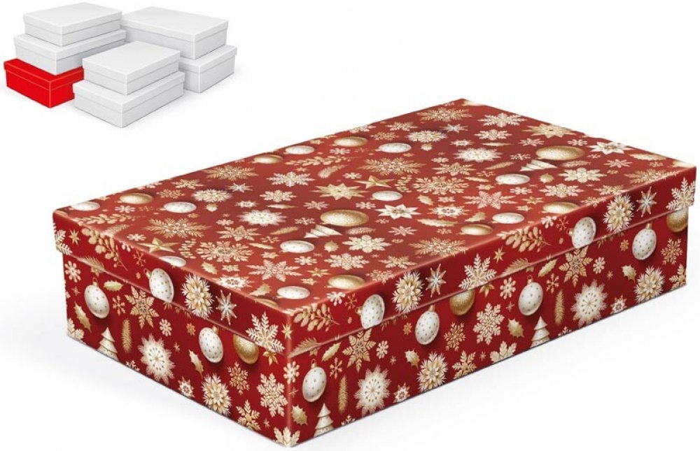 Prostorná vánoční dárková krabice v červeném provedení se zlatými a bílými motivy vloček, hvězd a ozdob dodá každému daru slavnostní nádech a stane se ozdobou pod stromečkem. Její výrazný design navodí opravdovou sváteční atmosféru a z balení dárků udělá radost sama o sobě.