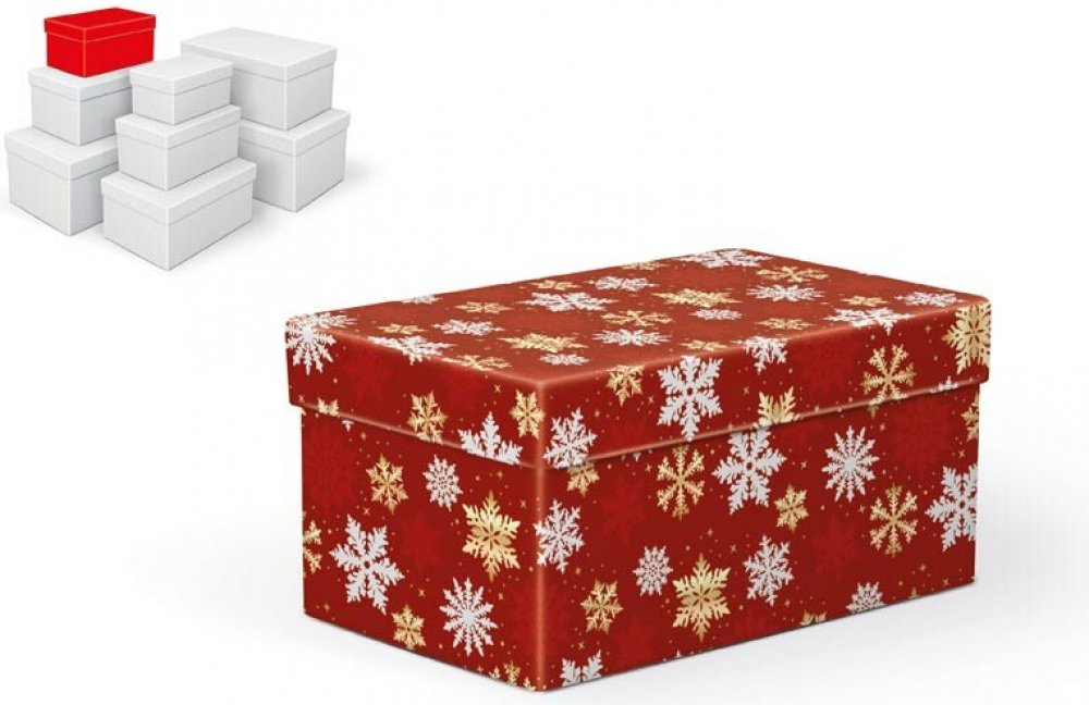 Vánoční dárková krabice o rozměrech 18 x 11 x 9 cm Vánoční dárková krabice je vyrobena z pevného kartonu a pokryta dekorativním papírem s vánočními motivy. Povrch krabice zdobí vzor s bílými a zlatými vločkami. Barva pozadí je červená, což vytváří krásný kontrast s barevnými motivy. Jejich slavnostní a elegantní vzhled je ideální pro balení vánočních dárků. Materiál: 1,5 mm karton, potažený luxusn...