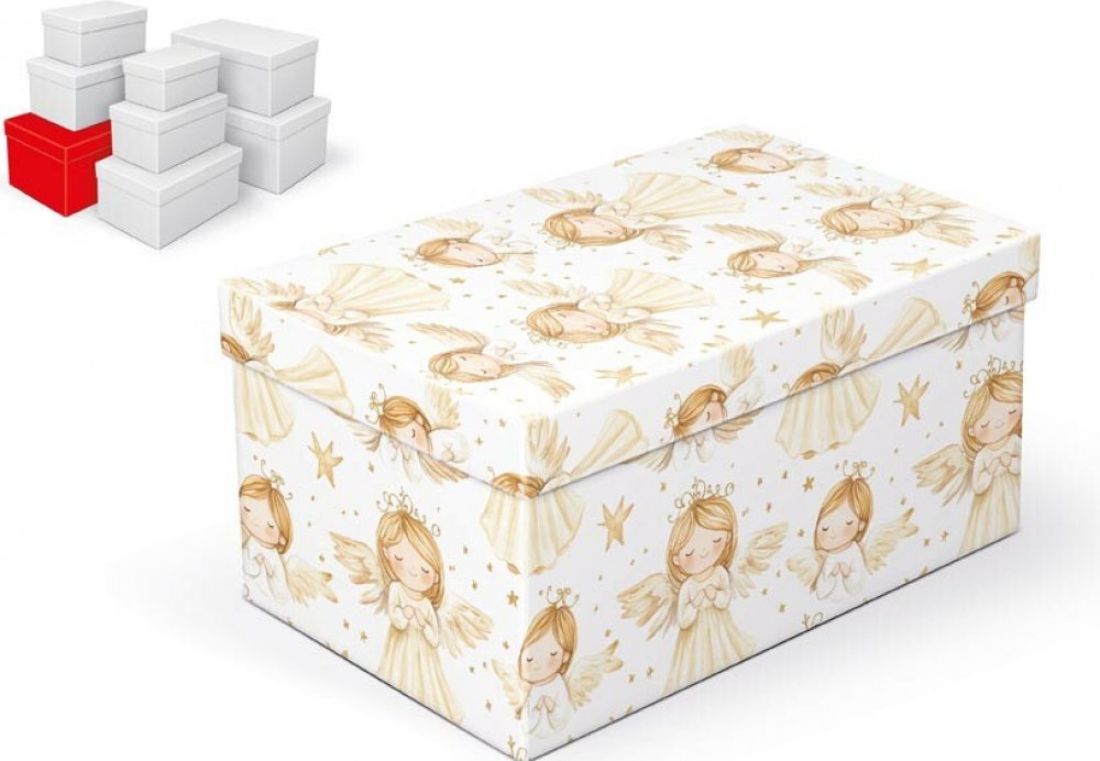 Vánoční krabička s motivem andílků a zlatých hvězdiček usnadní balení dárků a zároveň jim dodá krásný vzhled. Díky svému zpracování působí čistě, elegantně a není potřeba ji dále zdobit. Stačí vložit dárek dovnitř a máte připravené balení, které udělá dojem už při předání.