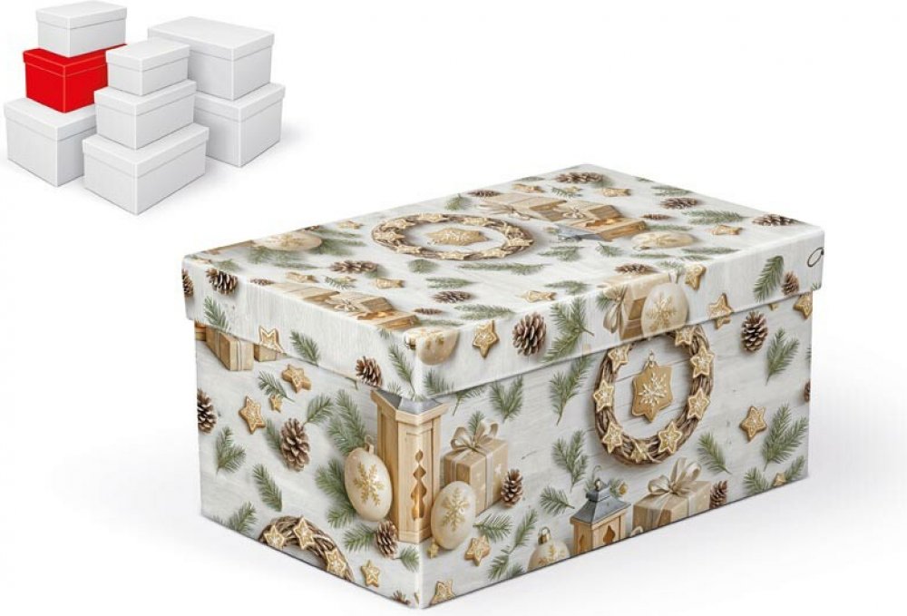 Pod stromečkem vynikne nejen dárek, ale i to, jak je zabalený. Vánoční dárková krabička s motivem přírodních dekorací, šišek a zlatých ozdob vnese do balení kousek kouzla a dárku dodá vzhled, který si zaslouží. Krabička je pevná a praktická, takže se postará o bezpečí obsahu a zároveň působí elegantně.