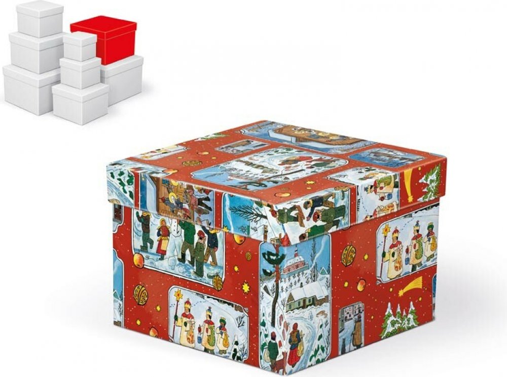 Vánoční dárková krabice s motivy Josefa Lady o rozměrech 18 x 18 x 13 cm Uvedená cena je za 1 ks. Materiál: 1,5 mm karton, potažený luxusním papírem.