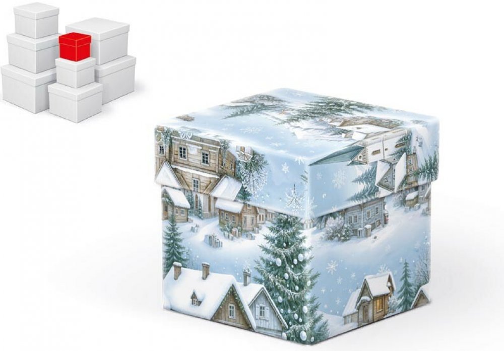 Drobné dárky si zaslouží obal, který jim dodá výjimečnost. Tato krabička je ideální na šperky, pralinky, mini svíčky nebo jiné malé pozornosti. Zdobí ji kouzelný motiv zimní vesničky – zasněžené chaloupky, vánoční stromky a jemné sněhové vločky, které vnesou do balení pohodu zimních svátků.