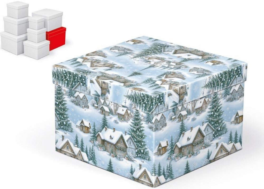 Vánoce jsou i o tom, jak dárek působí, když se objeví pod stromečkem. Krabička s motivem zimní vesničky se zasněženými chaloupkami a stromečky dokáže vykouzlit příjemnou atmosféru ještě předtím, než se víko otevře.