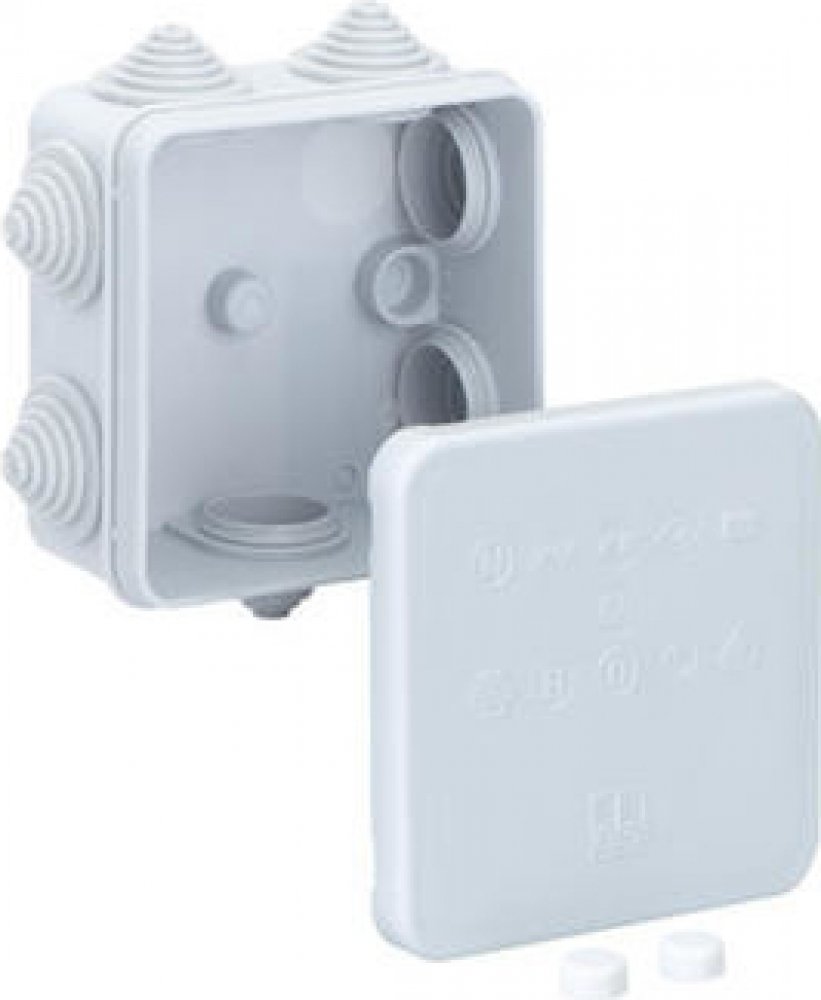 Spojovací krabice podle DIN EN 60670 (VDE 0606), 7 osazených stupňovitých vývodek, Rozsah těsnění 5 - 16 mm, pro svorky do 2,5 mm² šedá, bez svorek Technické údajeRozměry: šířka: 85 mm délka: 85 mm výška: 42 mm Inner height: 38 mm Inner width: 78 mm Materiál: Základna: Polypropylen, samozhášivý Krytí: Polypropylen, samozhášivý Ostatní atributy: Osazení: Bez Celkový počet přívodů: 7 Průřez vodiče: 2,5 mm² Možnost řazení: Ne Jmenovité izolační střídavé napětí: 400 V Ochrana proti výbuchu: bez Zachování funkčnosti: bez plombovatelné: Ne bez těžkých kovů: Ano neobsahuje PVC: Ano Neobsahuje silikon: Ano Krytí: IP55 - podle EN 60529 / DIN VDE 0470-1 Okolní teplota (min.): -25 °C Okolní teplota (max.): 40 °C Okolní teplota (24 hod): 35 °C Max. rel. vlhkost vzduchu při 25° C (krátkodobě): 95% Max. rel. vlhkost vzduchu při 40 °C: 50% Odolnost proti povětrnostním vlivům: Ne