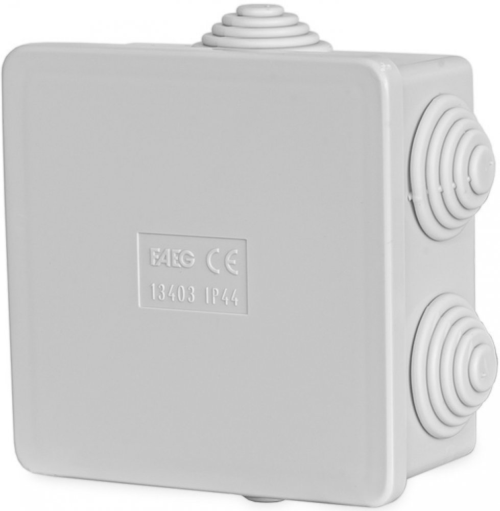 Rozbočovacia krabica na povrch s gumenými priechodkami a krytím IP 44 vyrobená z kvalitného a vysoko odolného plastu.