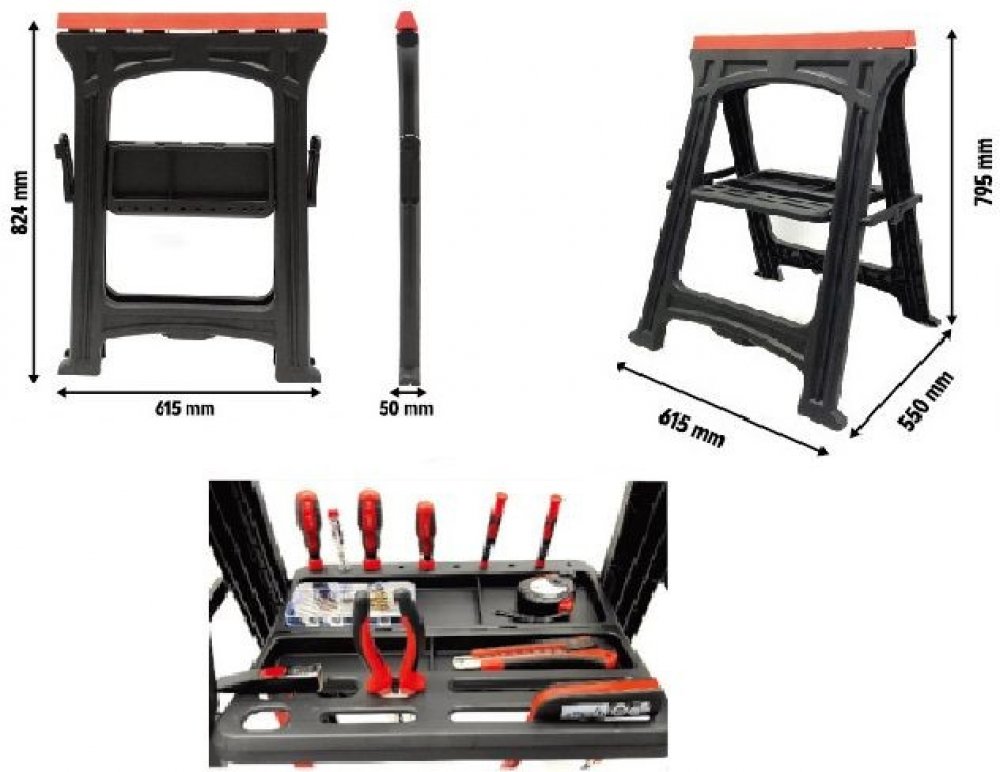 Jedinečným prvkem tohoto stavebního podstavce je jeho odkládací plocha, která poskytuje praktický prostor pro nářadí a další potřebné předměty. Tato funkce zvyšuje efektivitu práce a usnadňuje organizaci nástrojů přímo na pracovišti.