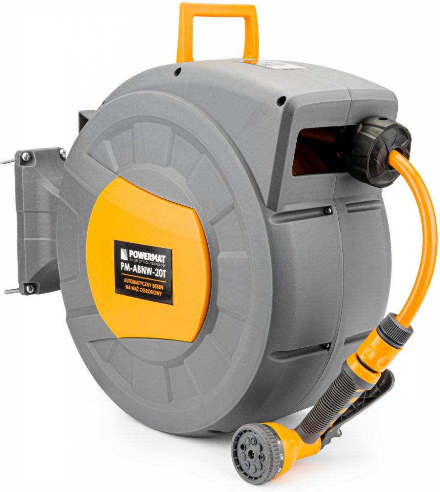 Automatický naviják na zahradní hadici od značky POWERMAT je určen pro pohodlné skladování a používání zahradní hadice. Díky automatickému navíjení hadice nebylo nikdy tak zábavné zavlažování, kropení a všechny druhy práce se zahradní hadicí. Buben zajistí pohodlnou práci a zabrání zamotání a ohnutí hadice. Buben má 2–3 aretační polohy na metr, což výrazně usnadňuje nastavení požadovaného rozsahu použití. Zaručuje také snadné a bezpečné uložení hadice v odolném a kompaktním krytu. Díky integrované rukojeti je používání nástroje ještě snazší. Můžeme jej snadno přesunout na jakékoli místo. Nízká hmotnost (8 kg) se navíc promítá do pohodlí práce. Součást zásilky: