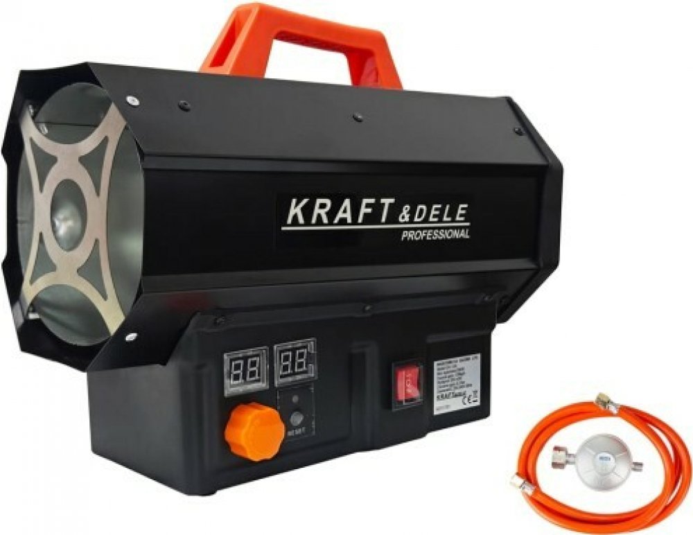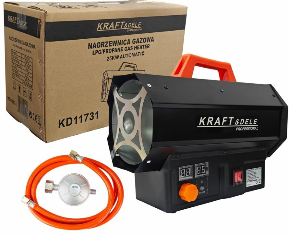 Ohřívač značky Kraft&Dele model KD11731 o výkonu 25 kW na plyn propan-butan (LPG). Ohřívač má vestavěný termostat s možností nastavení teploty. Ohřívač pracuje automaticky dle nastavené teploty.