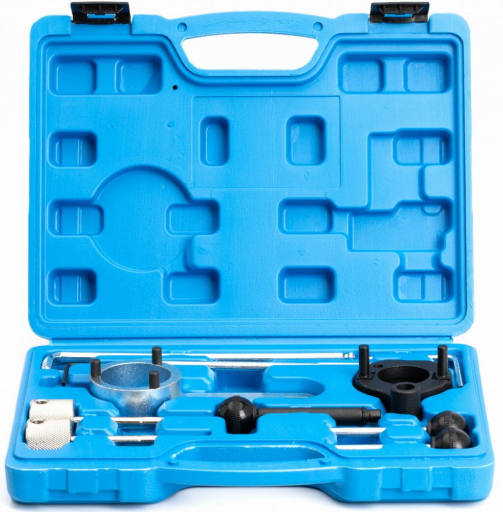 Sada obsahuje různé přípravky pro aretaci klikové hřídele, řemenic vačkové hřídele a palivového čerpadla. Tyto nástroje umožňují zablokování důležitých součástí motoru při demontáži a výměně rozvodového řemene nebo vačkové hřídele, čímž se minimalizuje riziko chyb a zajišťuje bezpečný a efektivní průběh práce.