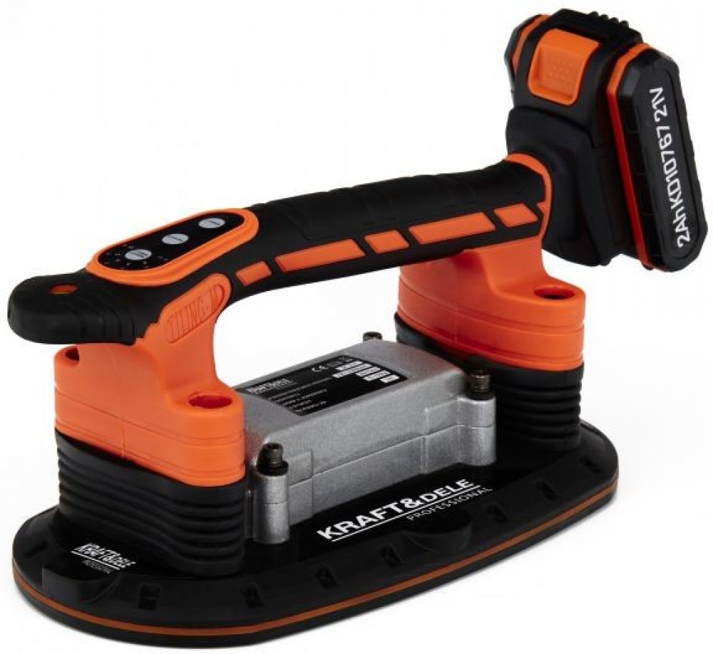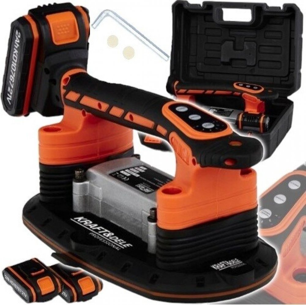 Akumulátorová vibrační přísavka KD10767 značky Kraft&Dele je ideální nástroj pro snadnou manipulaci s dlaždicemi a jinými materiály. Díky sací síle až 150 kg umožňuje bezpečné a přesné pokládání dlaždic. Vibrační funkce eliminuje vzduchové bubliny, které mohou způsobit nerovnosti nebo praskliny.