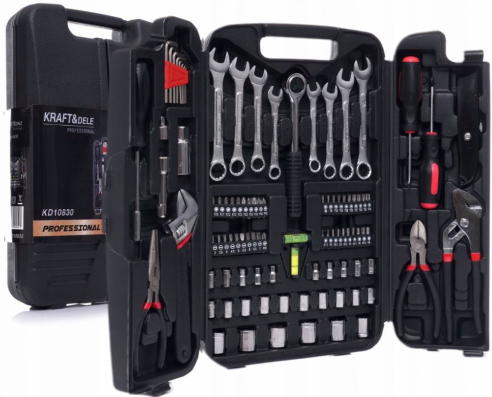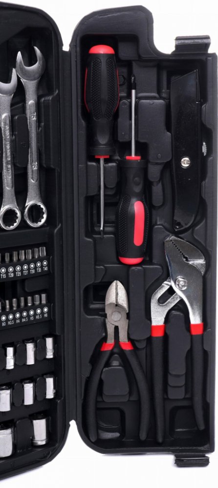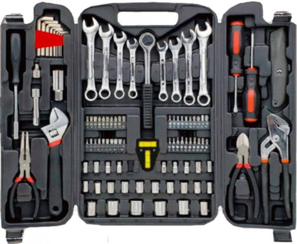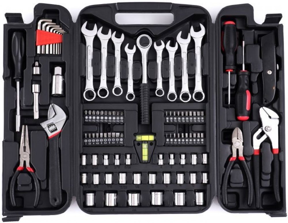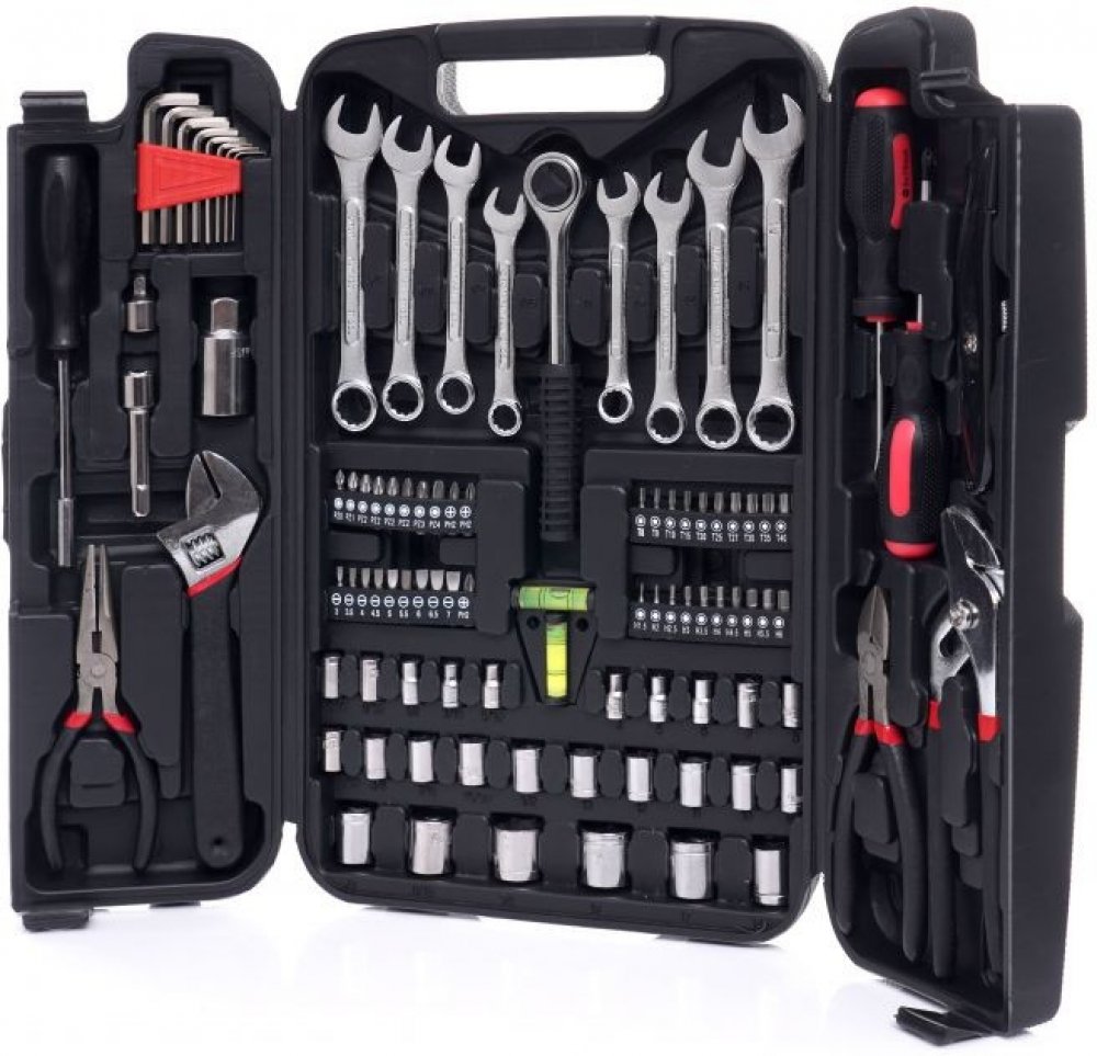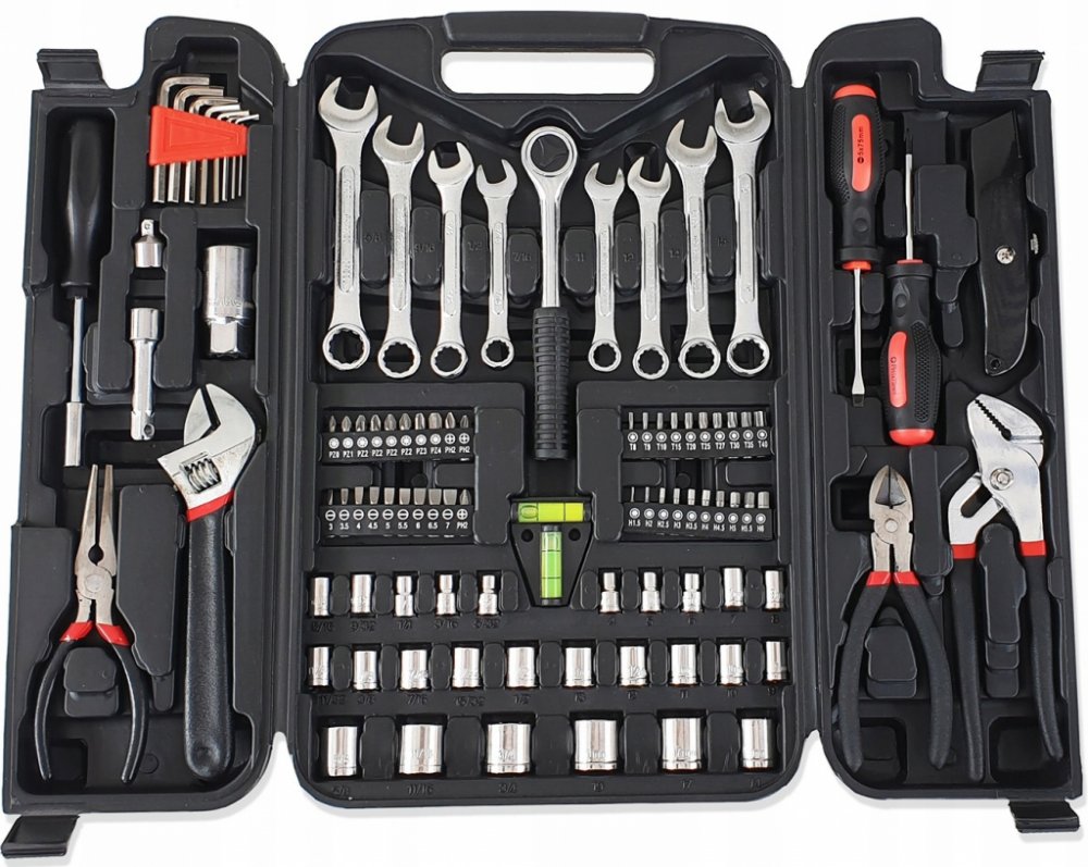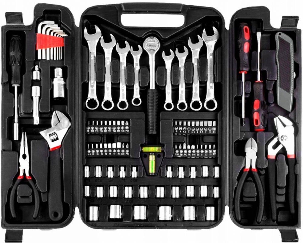 otevřené klíče, nástrčné klíče, ráčna, sada kleští, svorky, imbusové klíče, nůž a také šroubováky a bity.