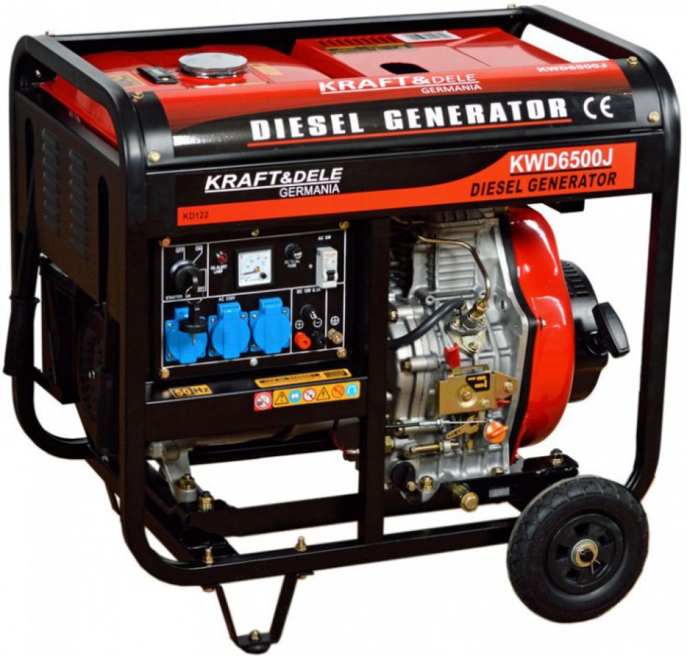 ELEKTROCENTRÁLA DIESEL 6500W 12 / 230V KD122 Přenosná jednofázová elektrocentrála je určena ke generování střídavého proudu 220V-230V. Elektrocentrála je ideální pro staveniště, domy, letní domy, kempy a všude tam, kde potřebujeme silný a stabilní zdroj energie. Motor agregátu má pochromovaný píst, proto se vyznačuje tichým a plynulým chodem a zároveň je velmi úsporný. Gumové stabilizátory motoru a držáky motoru tlumí vibrace a minimalizují hluk. Generátor je vybaven voltmetrem a stabilizátorem napětí, jakož i výstupem 12V na nabíjení baterie. Generátor energie je vybaven odolnými kolečky a dvěma držadly, které usnadňují přemisťování jednotky. Na rozdíl od tradičních generátorů, které běží při konstantních otáčkách za minutu, je tato elektrocentrála vybavená mikroprocesorem s technologií Smart Throttle, který upravuje otáčky motoru tak, aby se přesně vyrovnal se zátěží. Pokud generátor nezásobuje mnoho zařízení, pracuje pomaleji. Generátor tedy snižuje spotřebu paliva, prodlužuje životnost motoru a prodlužuje intervaly mezi naplněním palivové nádrže. Se zvyšujícím se zatížením generátor automaticky zvýší rychlost a otáčky, aby odpovídal požadavkům na energii. Standardní elektrocentrály fungují na principu kolísání proudu - světla zhasnou a potom opět září na plnou sílu. Tyto výkyvy energie jsou nebezpečné pro mnoho moderních a choulostivých zařízení, například počítač napájen obyčejným generátorem může vypnout nebo poškodit. Tato situace nenastane v případě chladiče se systémem AVR, který je zabudován v této elektrocentrále. Nejdůležitější prvky generátoru, jako jsou statory a rotory používané v generátorech Kraft & Dele, jsou vyrobeny z čisté mědi nejvyšší kvality s velmi dobrou elektrickou vodivostí. Použití kvalitní mědi umožňuje delší životnost, což se projevuje menší tvorbou tepla. Díky tomu dosahuje účinnost až o 5% vyšší než agregáty s tradičním hliníkovým vinutím. 1. Zásuvky 230V AC 2. Zásuvka 12V DC 3. Uzemnění 4. Pojistka 12V 5. Ochrana proti zkratu 6. Pojistka 230V 7. Voltmetr 8. Výstražná LED dioda nízké hladiny oleje 9. Elektrický start TECHNICKÉ PARAMETRY Značka: KRAFT & DELE Model: KD122 Napětí: 230V / 50Hz jednofázové Motor: vzduchem chlazený DIESEL Počet zásuvek: 3x 230V / 1x 12V Výkon motoru: 10 HP Maximální výkon generátoru: 6 500 W Trvalý výkon generátoru: 6000W Stabilizátor napětí: Ano, AVR Startování: na klíč / manuální Voltmetr: ano Palivoměr: ano Funkce usměrňovače: ano, 12V / 8,3A Objem palivové nádrže: cca 10L (cca 11-12 hodin práce na nádrži) Generátor mědi: ANO Výkon: motorová nafta Materiály: nerezová ocel, hliník, plast Namontované na polštářích absorbujících nárazy: ano Hmotnost: 110 kg OBSAH BALENÍ: Generátor energie KD122 Kabely na nabíjení baterií Klíč na svíčky šroubovák 3x zásuvka 230V Uživatelská příručka