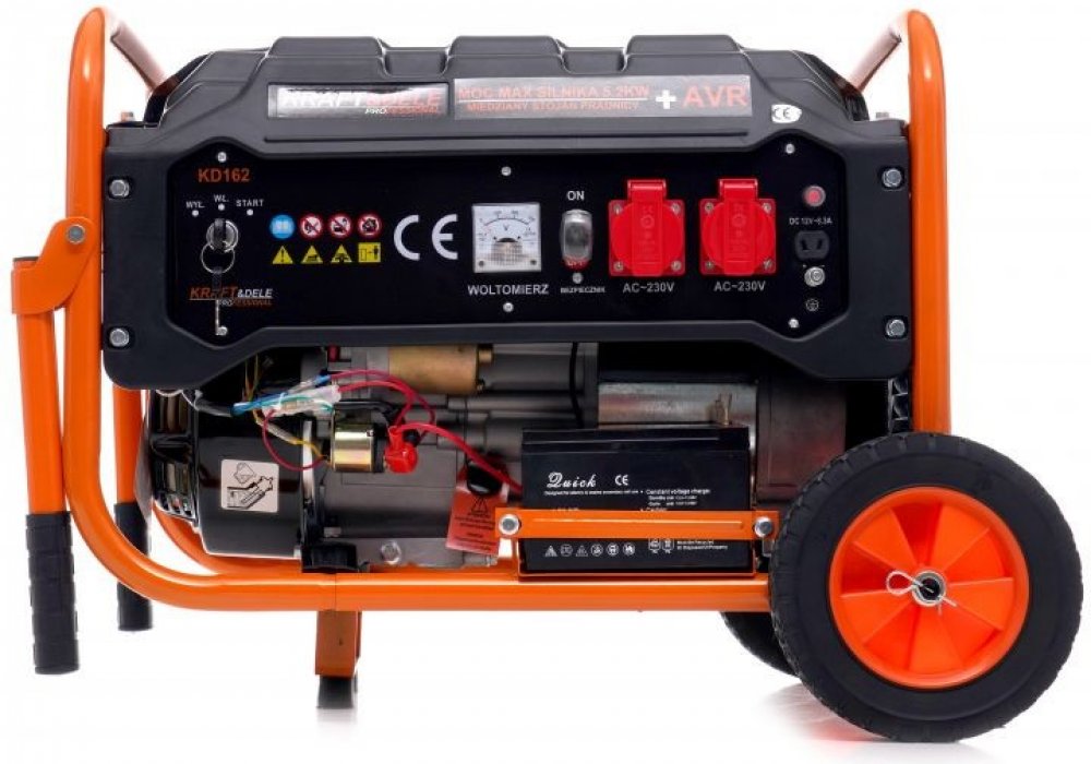 POPISPřenosný třífázový generátor s označením KD163 od Kraft & Dele je navržen pro výrobu elektřiny 220V-400V pomocí japonského čtyřdobého spalovacího motoru OHV s výkonem 7HP/5,2KW a jmenovitým výkonem generátoru 00W/h3.Tento model je vybaven automatickým spouštěním klíčem. Součástí je baterie, která napájí startér. Už žádné tahání za kabel ke spuštění generátoru! Stačí otočit klíčkem a zařízení je připraveno generovat energii.