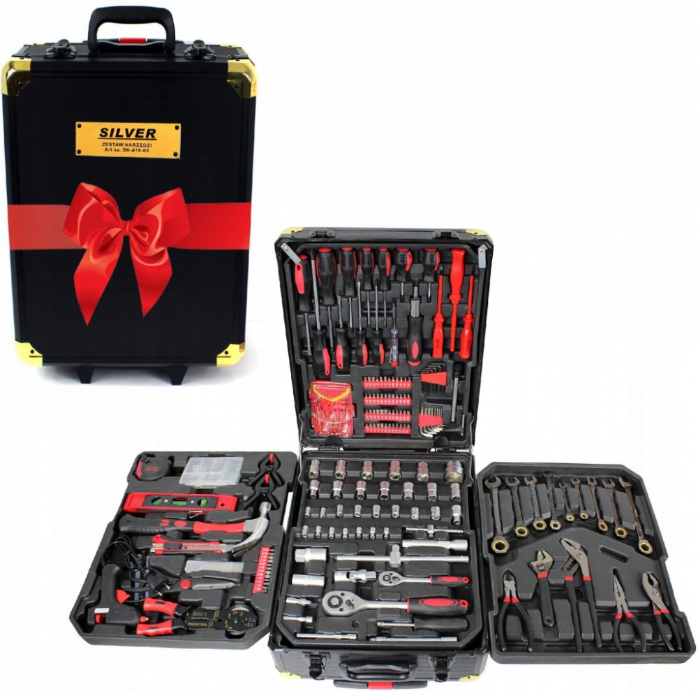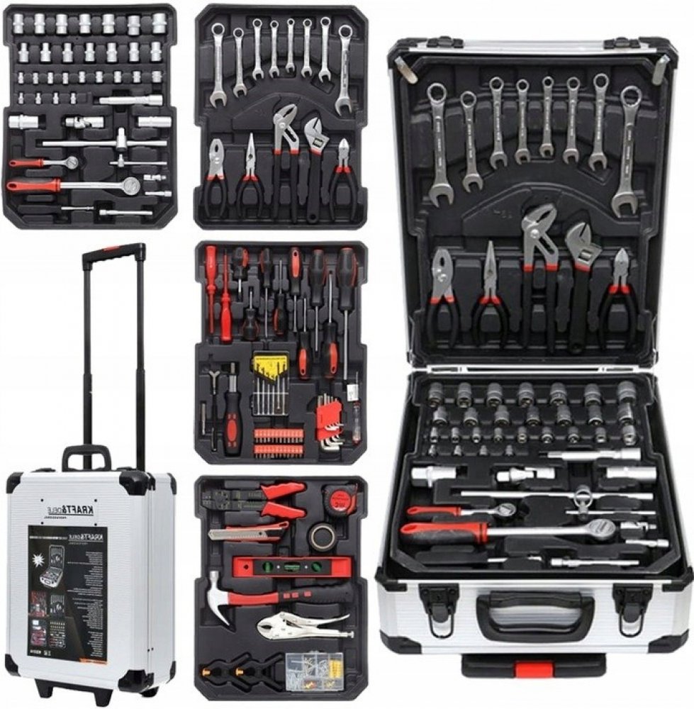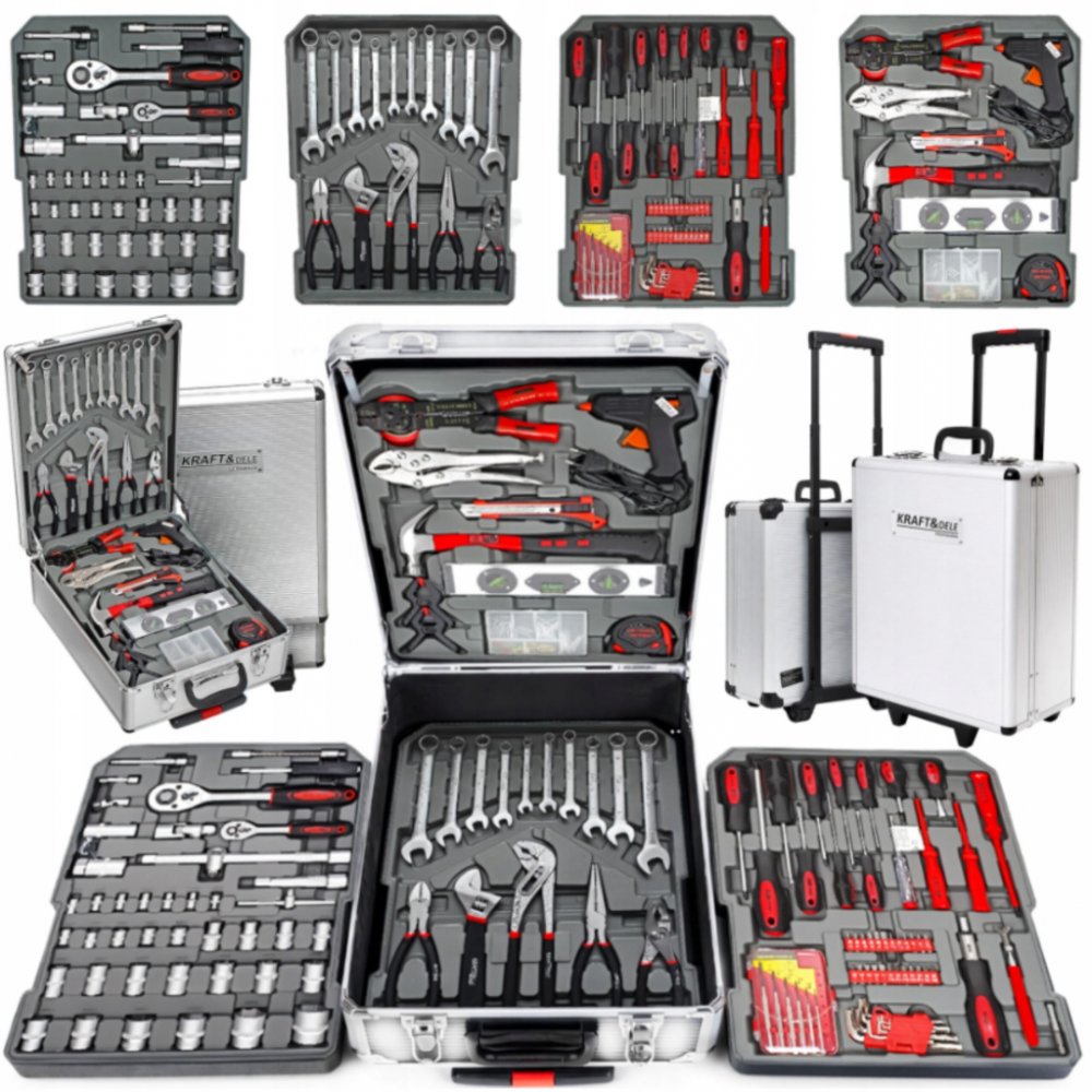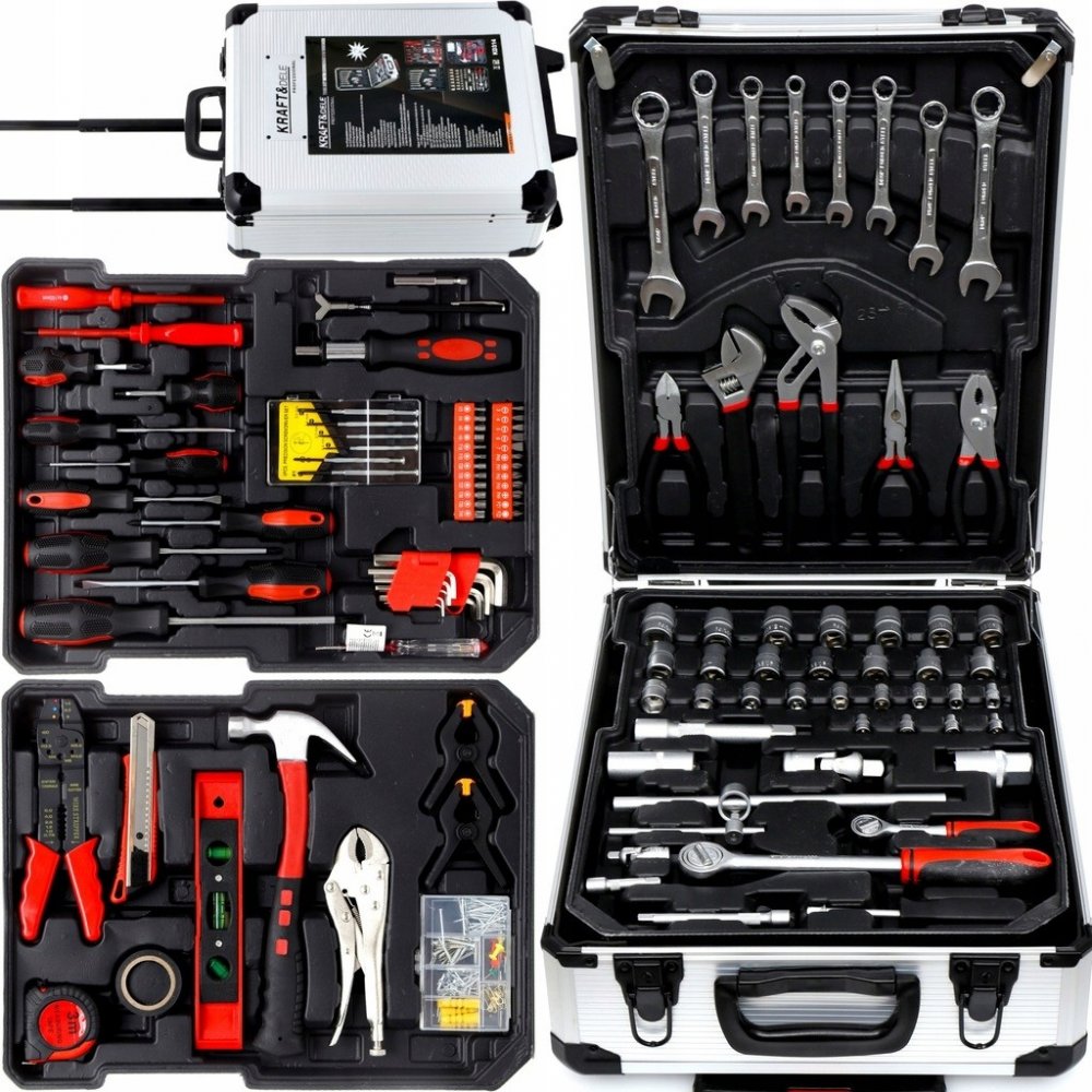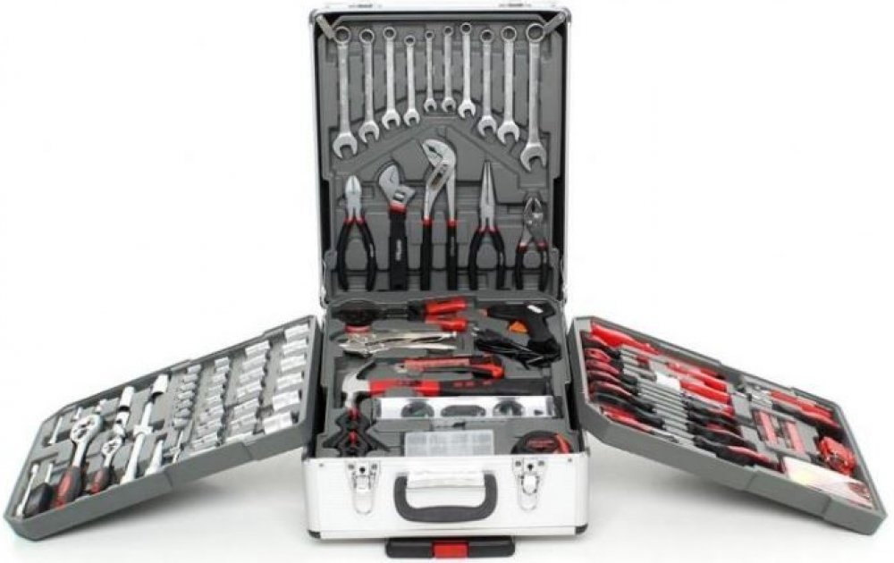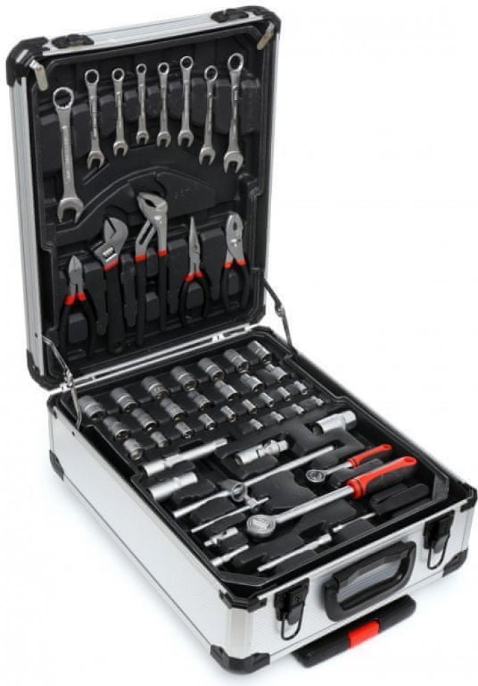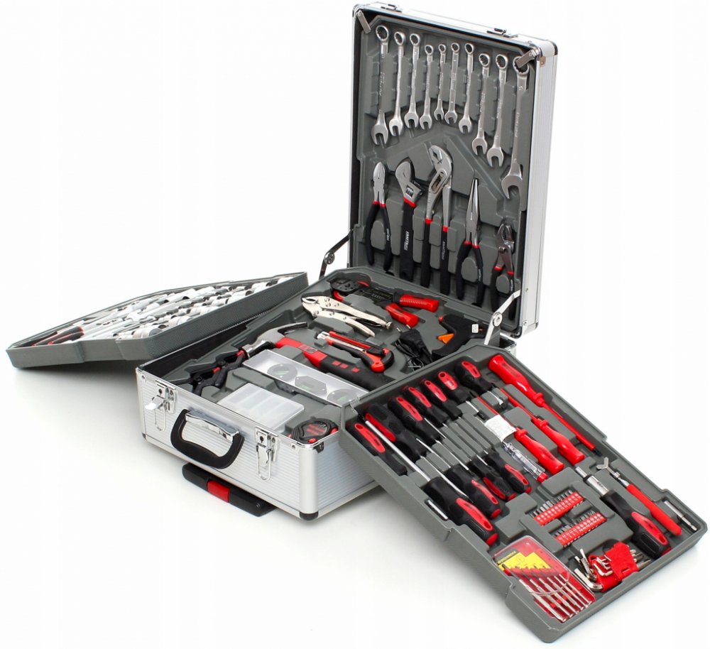 - v sadě najdete: ploché klíče, nástrčné klíče, ráčnu, kladivo, sadu kleští, vodováhy, svorky, metr, izolační páska, nůž, sada hřebíků a šroubů, dále šroubováky a bity